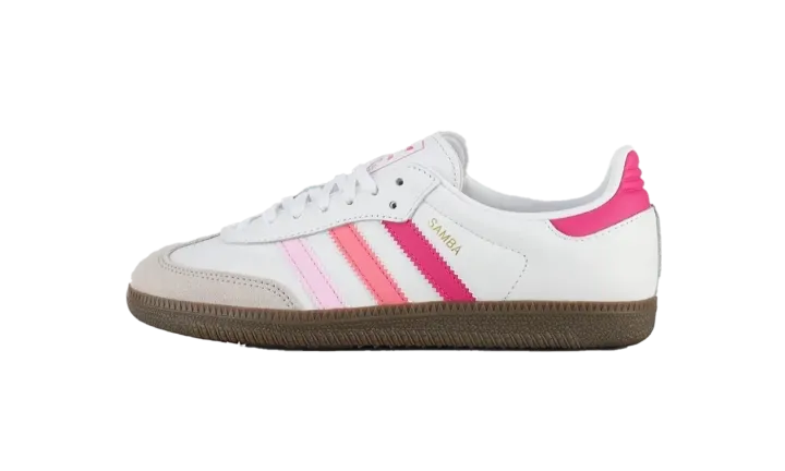 Step into a clean, cheerful aesthetic with the Adidas Samba OG GS "White / Orchid Fusion". This celebrated shoe for grade schoolers features a soft white leather upper complemented by vibrant Orchid Fusion accents and a classic gum sole. Enjoy the comfortable fit and timeless appeal, blending a classic silhouette with modern style for a versatile look that's perfect for any occasion.