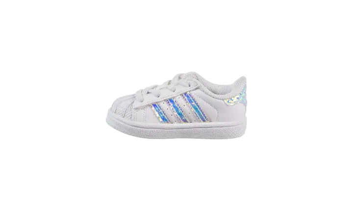 The Superstar TD 'Iridescent' shoe features a classic design with an iridescent finish, making it a vibrant and eye-catching addition to any sneaker collection.