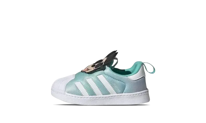 The Superstar 360 TD 'Disney - Mickey Mouse' shoe features a playful design inspired by the iconic Disney character Mickey Mouse, blending classic Adidas Superstar style with unique and charming details perfect for young fans.