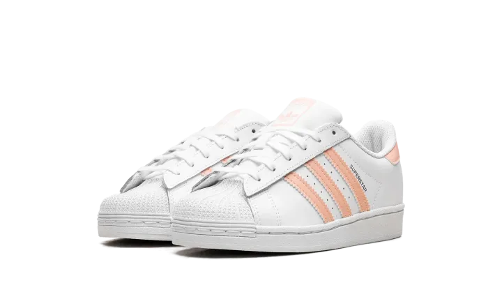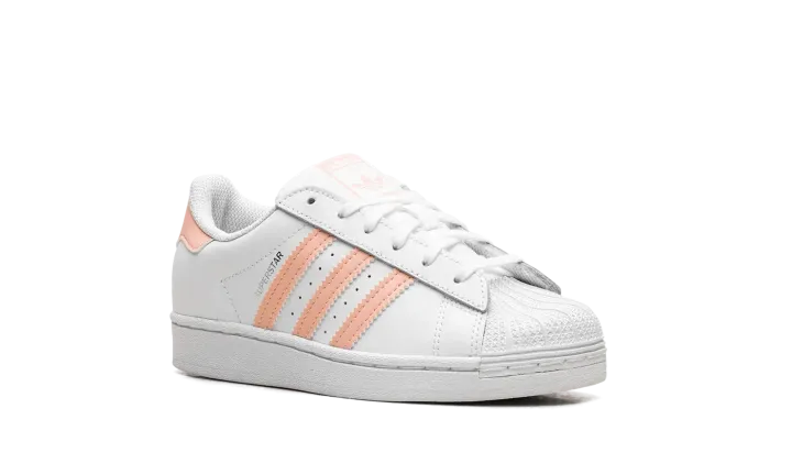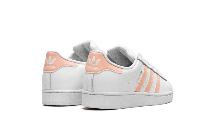 The Superstar 'Haze Coral' shoe features a classic design with a vibrant haze coral colorway, offering a fresh and bold addition to any sneaker collection.
