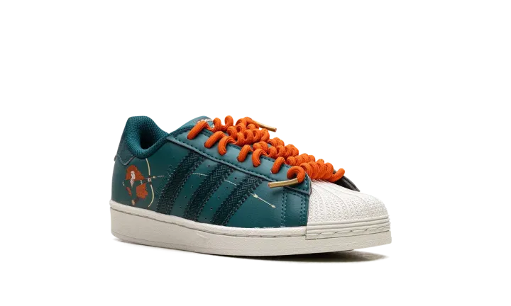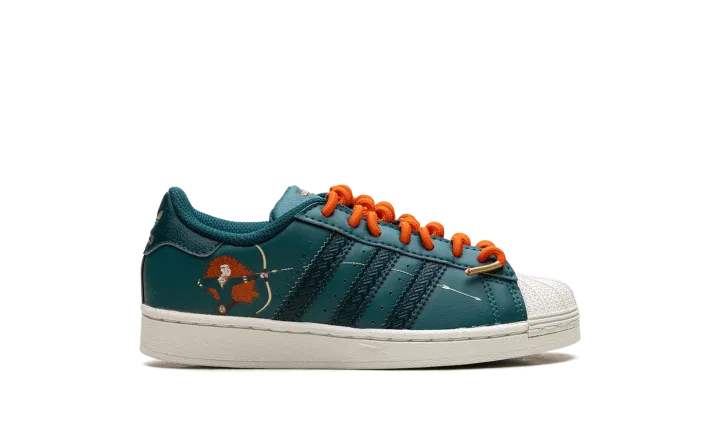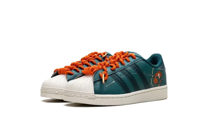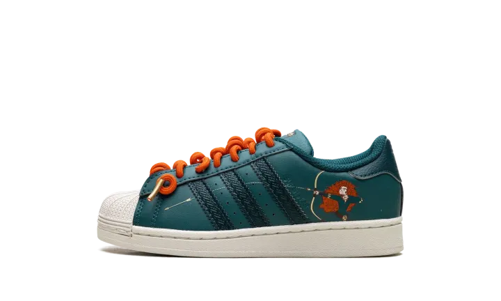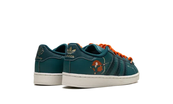 The Disney X Superstar C 'Brave / Princess Merida' shoe features a design inspired by Disney's Princess Merida, blending classic Adidas Superstar style with unique details from the movie "Brave."