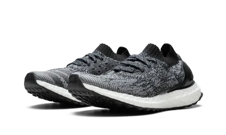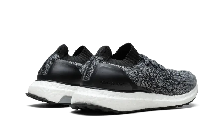 This kids-sized edition of the Ultra Boost Uncaged features a black and grey speckled Primeknit upper.