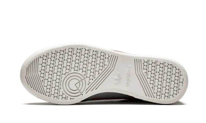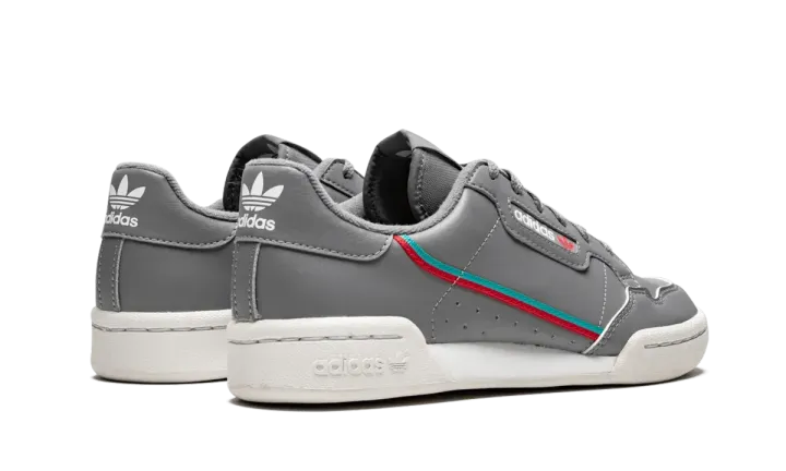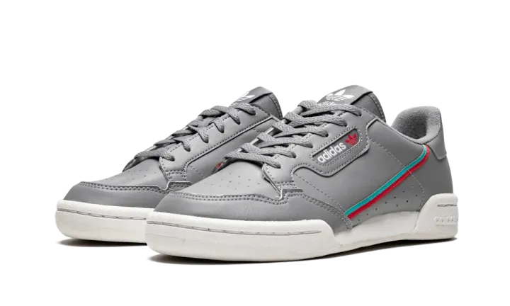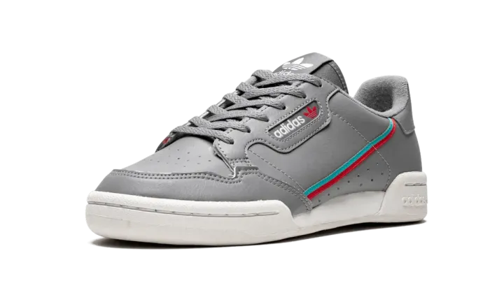 The adidas Continental 80 big kids' shoe is a go-to silhouette for everyday wear. The low-profile sneaker, originally a tennis shoe from the 1980s, features a grey full-grain leather upper and white foam midsole and rubber outsole. Thin turquoise and red textile stripes are applied to the upper, along with branding in the same colors just below the lacing system. The vintage adidas Trefoil logo is seen in multiple places, including the tongue, heel, and midfoot.