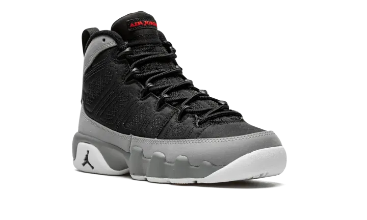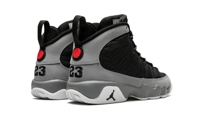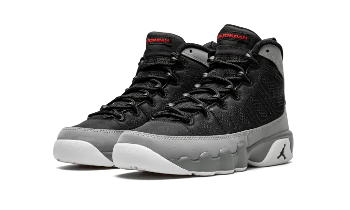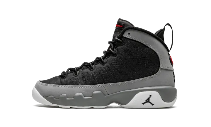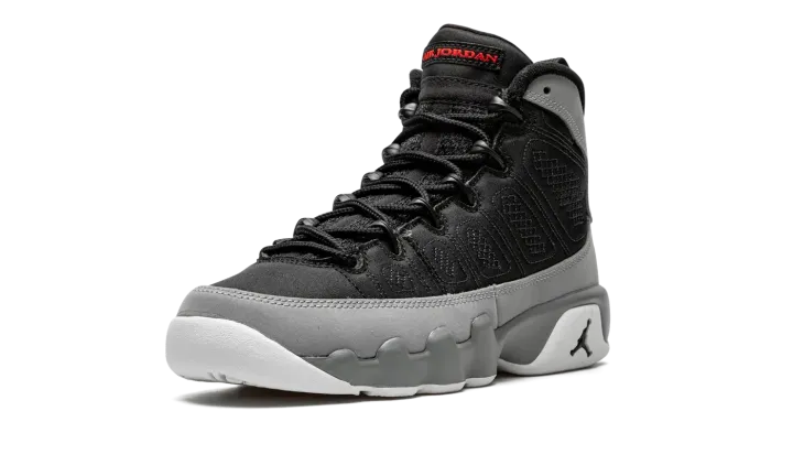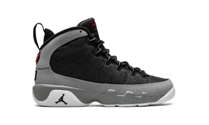 The Air Jordan 9 GS "Particle Grey" is the youth sizing for the simple yet striking take on a fan favorite Air Jordan model. This Jordan 9 for kids features a black textile base with Particle Grey leather overlays and contrasting red accents for the branding areas on the heel and tongue. A white rubber outsole completes the design.