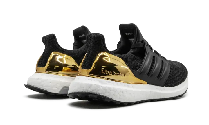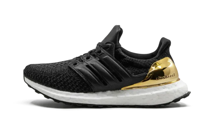 The adidas Ultra Boost comes in a preschooler version with a tiny-sized, limited-edition pair to match the adult model. Emulating the "Gold Medal" adult style from the "Medals Pack," this Ultra Boost celebrates the gold medal winners of the summer Olympics of 2016. The Primeknit upper sets the scene for a premium look with an upgraded black leather tongue and cage and striking metallic gold heel counter. Responsive cushioning is found in the Boost midsole and a grippy rubber sole allows kids to run around freely without slipping.