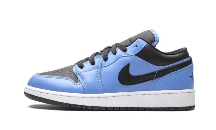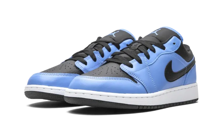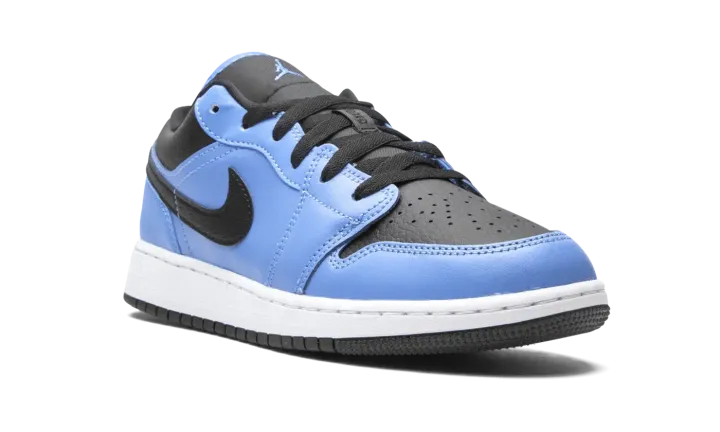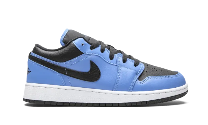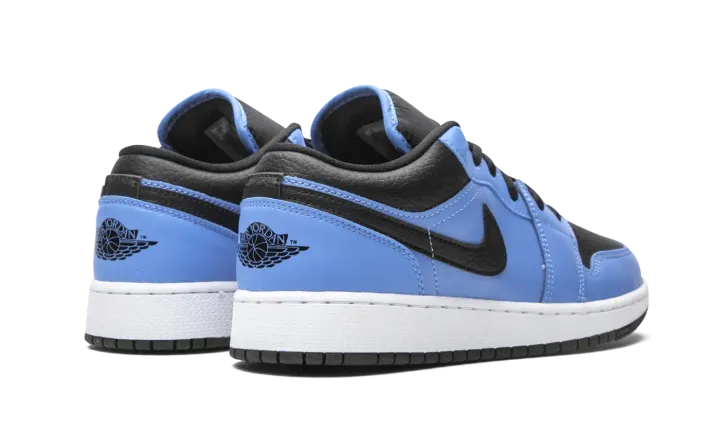 The Air Jordan 1 Low GS "University Blue/Black" is the youth sizing of Michael Jordan's first signature shoe in a colorway that pays homage to the UNC Tar Heels. Unofficially linked to "The GOAT's" alma mater, the "University Blue/Black" nonetheless features the school's team uniform colors on its design for yet another covetable Tar Heel inspired Air Jordan shoe. Details include University Blue leather on the forefoot, eyelets, mid-panel, and heel. Contrasting black leather can be found on the toe and collar and on the Swoosh branding on either side of the shoe. A black "Wings" logo is embroidered onto the heel and a mini blue Jumpman logo appears on the black nylon tongue to finish off the look.