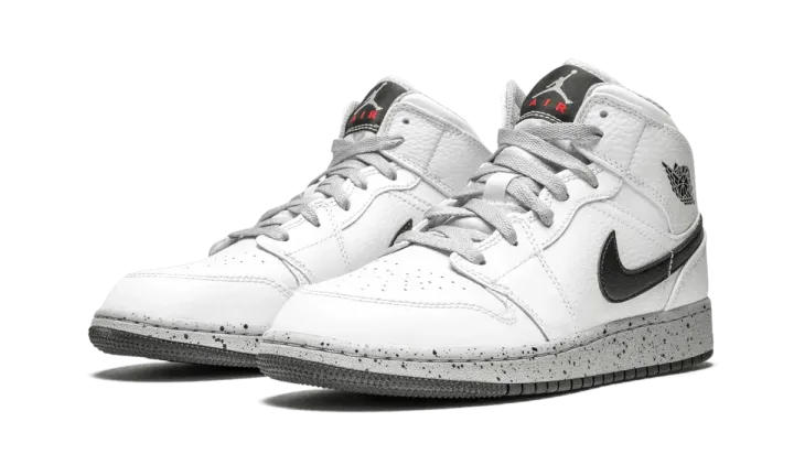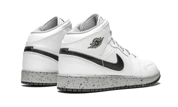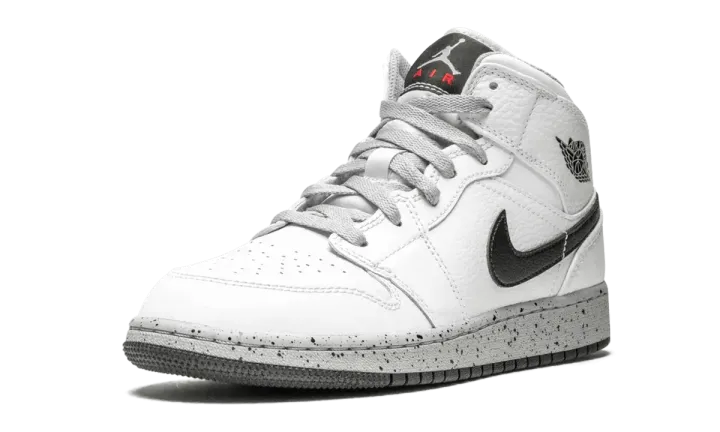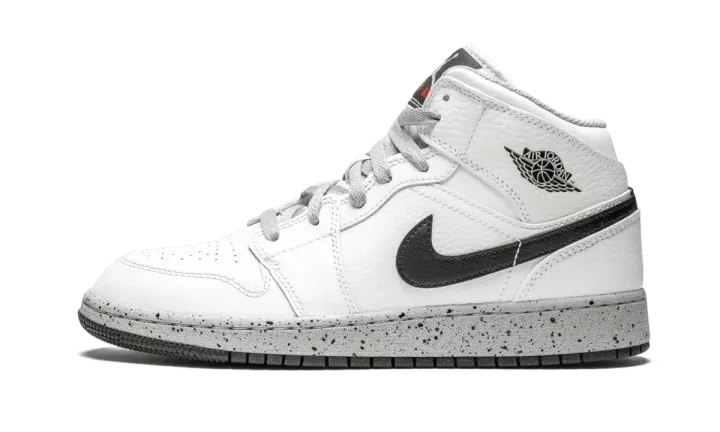 The Air Jordan 1 Mid GS brings on-court features and off-court style to any kids sneaker collection. This mid-top kids sneaker dazzles with a clean white base. Black details can be found on the Nike Swoosh, Jordan Wings logo, and rubber outsole. Grey outfits the laces, sockliner, and speckled midsole. A bit of red is seen on the "Air" of the Nike Air tongue badge logo. A cupsole construction with an encapsulated Air-Sole unit and deep flex grooves complete the Air Jordan 1 Mid design.