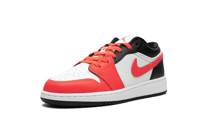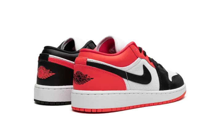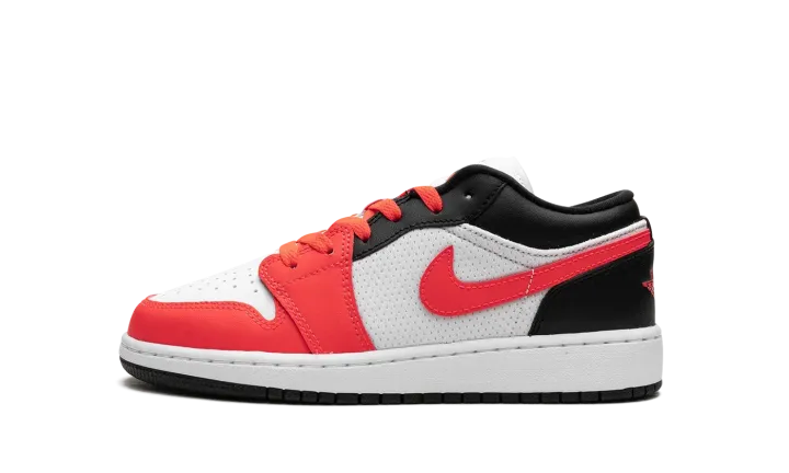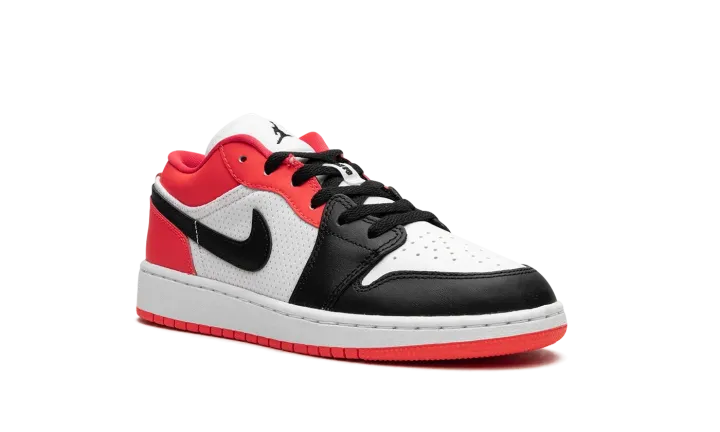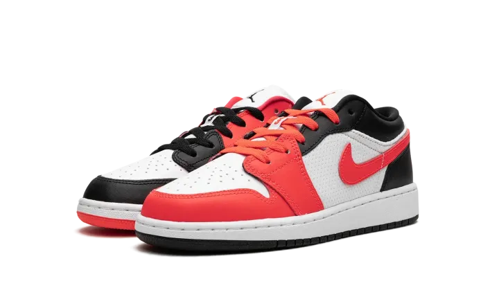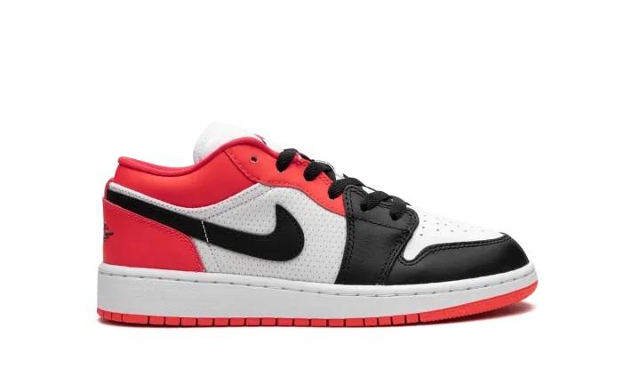 The Air Jordan 1 Low GS "Mismatch Chicago" is a colorful look for the youth sizing of the low-top Jordan 1 with a mismatched color block inspired by Michael Jordan's time with the Chicago Bulls. The "Mismatch Chicago" puts a unique spin on the popular "Chicago" Jordan 1 theme with a mismatched color pattern highlighted by Infrared instead of a more traditional shade of red usually associated with the Chicago Bulls team colors. The shoe features a white base with smooth leather on the perforated toe and mesh material on the sides. Hues of Infrared and black leather are found on the toe cap, forefoot, and eyelet panels. Mismatched Infared and black leather Swooshes appear on both sides of the left and right shoe, as well.