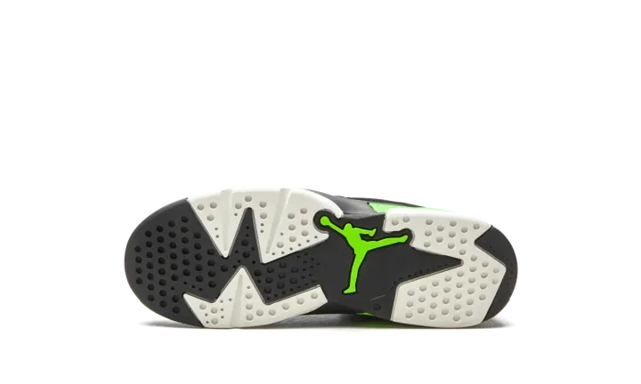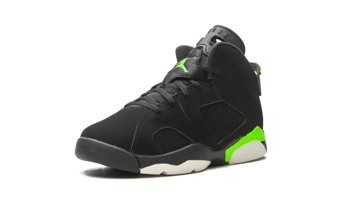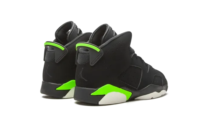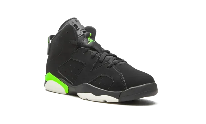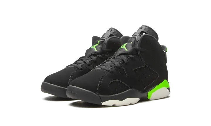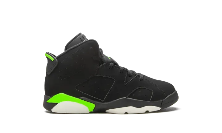 The Air Jordan 6 PS "Electric Green" is the preschool version of the Summer 2021 colorway of Michael Jordan's sixth signature shoe inspired by an unreleased Oregon Ducks Player Exclusive style. Part of the retro basketball shoe's 30th anniversary celebration, the "Electric Green" is one of several standout Jordan 6 colorways produced by Jordan Brand in 2021. Aesthetically, the "Electric Green" mimics the color block of the shoe's original "Infrared" makeup, trading the latter's fiery red accents for a bright neon green hue. The entire upper is constructed in a black synthetic nubuck material that allows for the Electric Green embroidered Jumpman on the nylon lace shroud to attract attention. Jordan Brand places additional neon green detailing on the spoiler and on the black midsole. Tonal Jumpman branding is embroidered on the heel. Release date: June 5, 2021