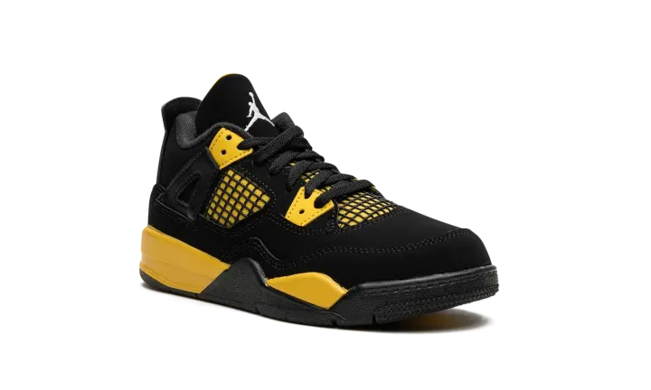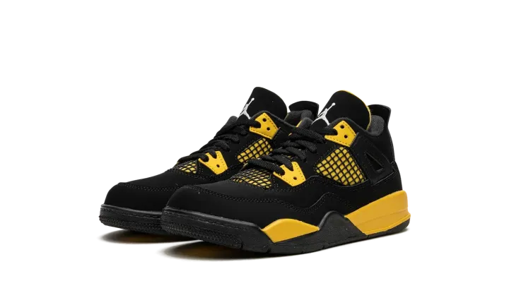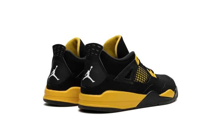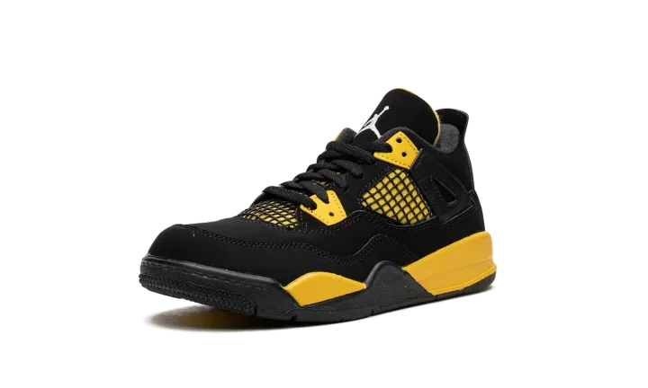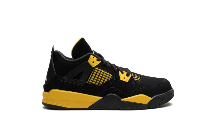 The Air Jordan 4 PS "Thunder" is the youth sizing of the modern re-release of the popular, non-original colorway of the vintage basketball shoe from 2006's "Thunder & Lightning" collection. Released with the Jordan 4 "Lightning" in super limited quantities on Jordan Brand's former Jumpman23.com website back in the day, the "Thunder" was re-released in 2012 before it received another highly anticipated release in 2023. As for its design, the black-and-yellow shoe features a black synthetic nubuck base with Tour Yellow detailing beneath the mesh on the sides and tongue. Yellow lace holders contrast the black upper. A white Jumpman appears on the heel and on the tongue. Release date: May 13, 2023