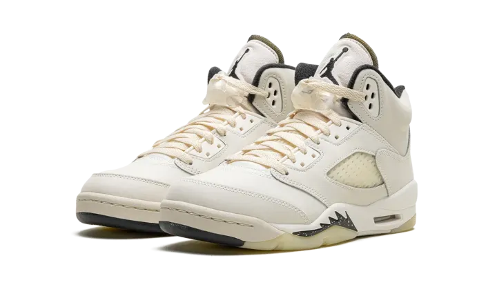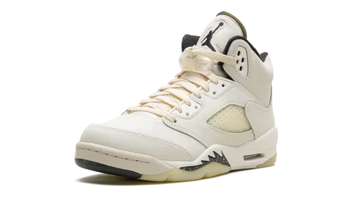 The Air Jordan 5 SE GS "Sail" is the youth sizing of Michael Jordan's fifth signature shoe with a versatile design. The "Sail" features a Sail leather base with Coconut Milk-colored accents on the netting found on the tongue and mid-panel. Contrasting black detailing is found on the Jumpman on the tongue, as well as on the inner lining, and Jumpman on the heel. Moreover, additional black detailing can be found on the speckled shark tooth design on the forefoot of the midsole. Underfoot, a Coconut Milk rubber outsole gives the shoe a classic, slightly aged aesthetic that ties into the Jordan 5's old school vibe. Release date: April 13, 2024