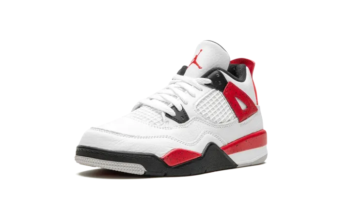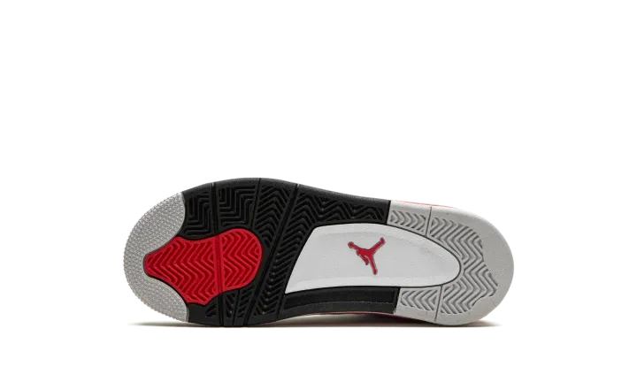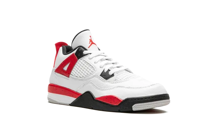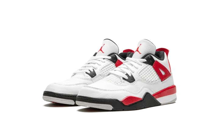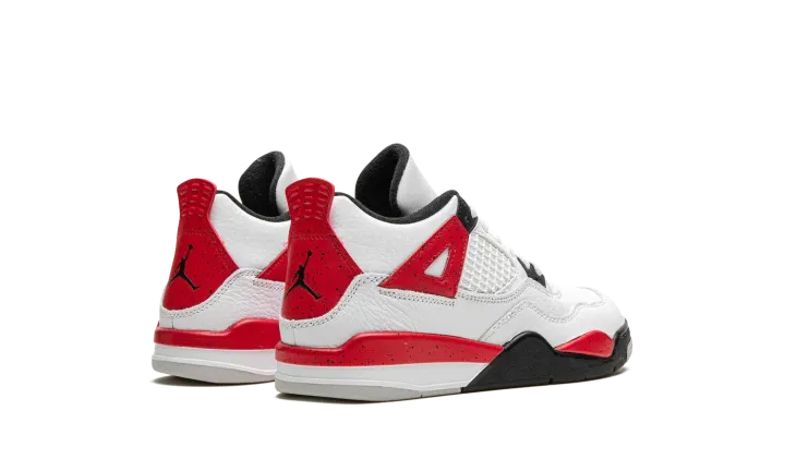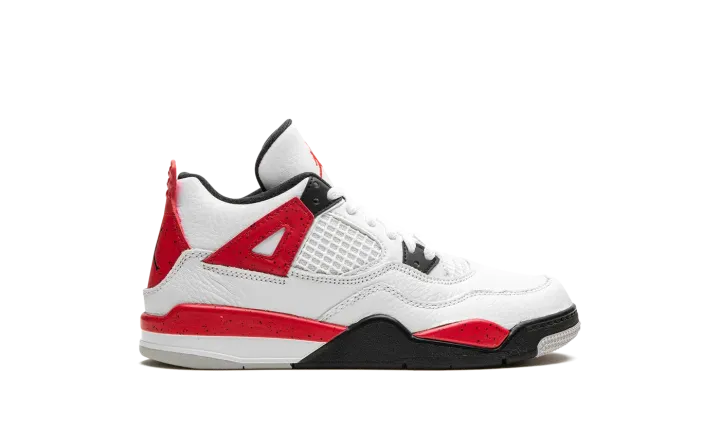The Air Jordan 4 PS "Red Cement" is the preschool sizing of the retro basketball sneaker in a colorway inspired by the Jordan 4's original "White Cement" style. The "Red Cement' Jordan 4 replicates the design of the model's "White Cement" colorway, but features red detailing whereas the "White Cement" has grey cement patterning. The "Red Cement" features a white leather upper with tonal leather overlays and white netting on the tongue and mid-panel. The black plastic eyelets are contrasted by Fire Red "wings" with speckle patterning. The fiery red speckled motif also appears on the shoe's mudguard and heel counter. A black Jumpman can be found on the tongue and heel. Release date: September 9, 2023