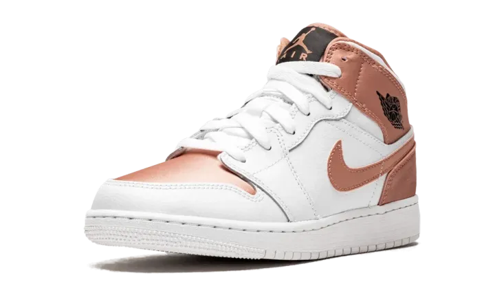 The Air Jordan 1 Mid GS is the grade school sizing of the first Air Jordan model, the Air Jordan 1. From its introductory release in 1985, the Air Jordan 1 model has proven to be virtually undefeated and this Air Jordan Mid is no different. Finished off in a refined two-toned upper of white tumbled leather, and rose gold overlays, the Air Jordan 1 Mid reflects many of the same qualities that made the high-top version one of the most popular sneakers of all time. White laces, midsole, and outsole pull the look together. The Air Jordan 1 Mid GS released on July 1st, 2019.