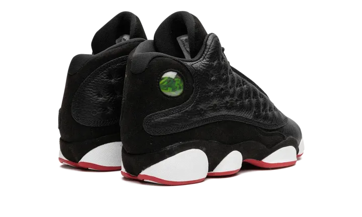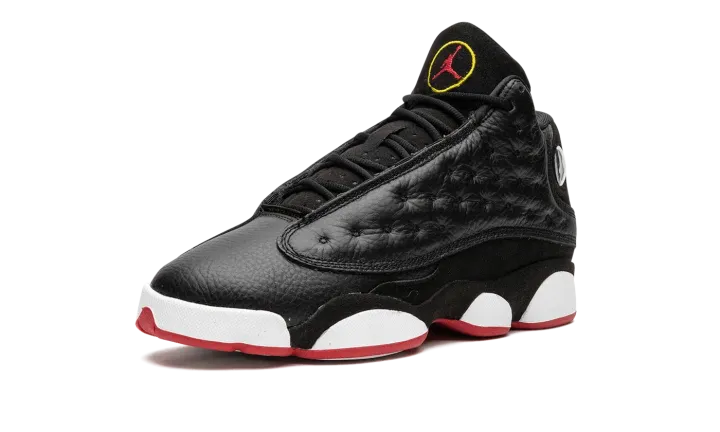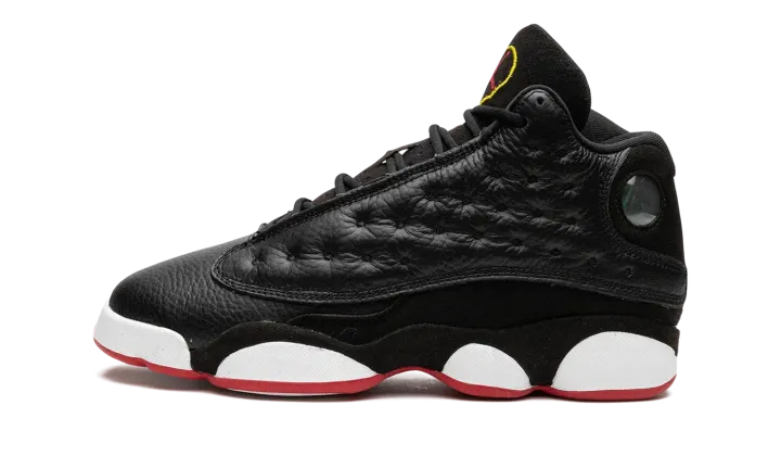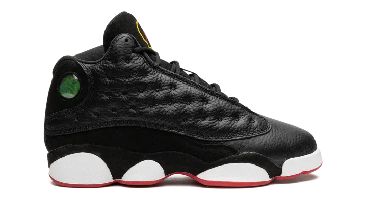 The Air Jordan 13 GS "Playoffs 2023" is the youth sizing of the popular, original colorway of Michael Jordan's thirteenth signature shoe. The Jordan 13 "Playoffs" was debuted by Jordan during the 1998 NBA All-Star Game before it was eventually worn by "His Airness" during the Chicago Bulls' memorable run during the '98 NBA Playoffs. The 2023 version of the "Playoffs" is a true remaster of the original version of the shoe that was released in '98. The colorway has a dotted black leather upper, a black leather toe, and black suede mudguard. A holographic, panther-eye-inspired emblem is found on the lateral side of the collar. Classic Jumpman branding appears in red within a yellow embroidered circle on the tongue. "Jordan" detailing is found on the vamp. White midsole walls complete the look of this classic sneaker. Release date: February 18, 2023