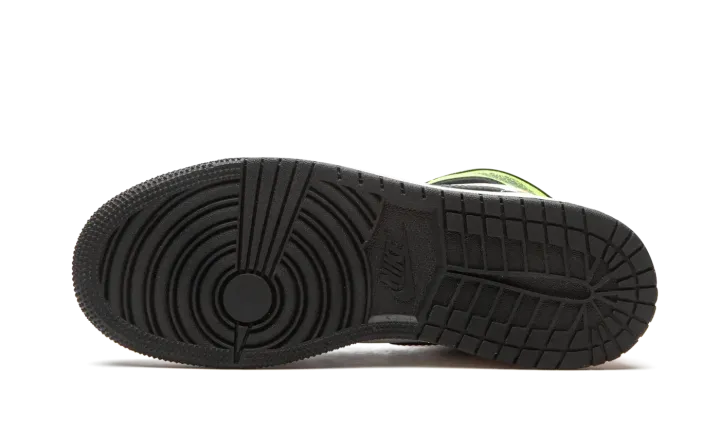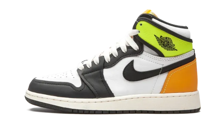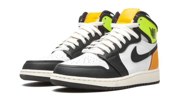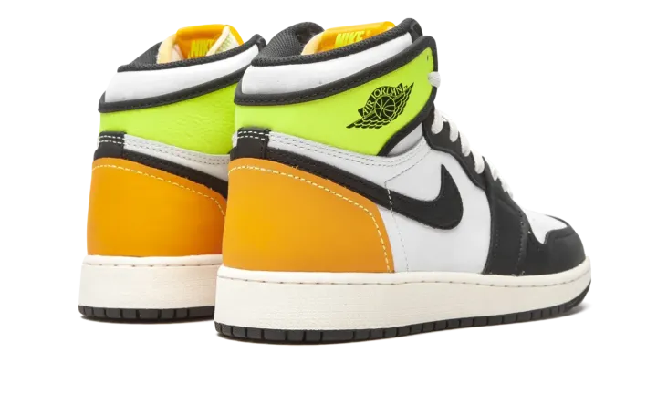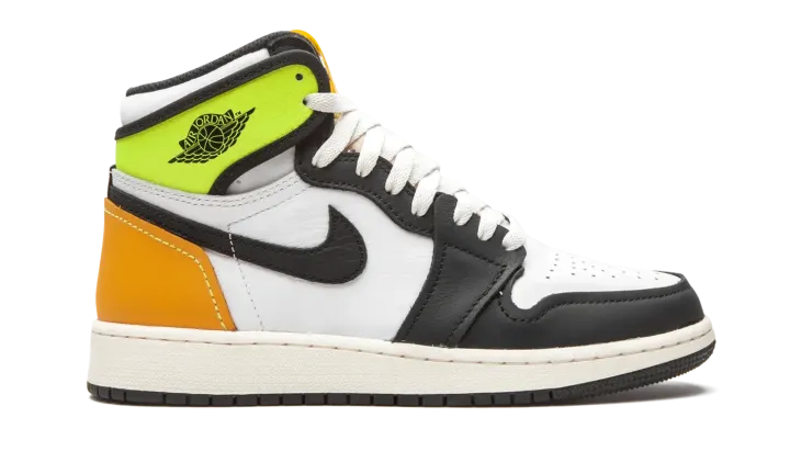 The Air Jordan 1 High GS "Gold Volt" is the youth sizing of Michael Jordan's first signature shoe in a "do-it-yourself" inspired colorway. A January 2021 release based loosely on Off-White's deconstructed Air Jordan 1 that appeared in Virgil Abloh's "The 10" collection, the "Gold Volt" is awash with contrasting shades of neon yellow and gold on its design. The "overcut" leather panels extend past the stitching play into the aforementioned aesthetic popularized by Abloh with "The 10." White leather can be found on the perforated toe and mid-panel. Contrasting black leather dots the forefoot, toe cap, and eyelets. A black "Wings" logo can be found on the Volt collar overlay and a black Swoosh appears on either side of the shoe. Jordan Brand adds a gold leather panel to the heel, cream laces, and a decidedly retro inspired cream midsole to round out the look of the "Gold Volt." Release date: January 9, 2021.