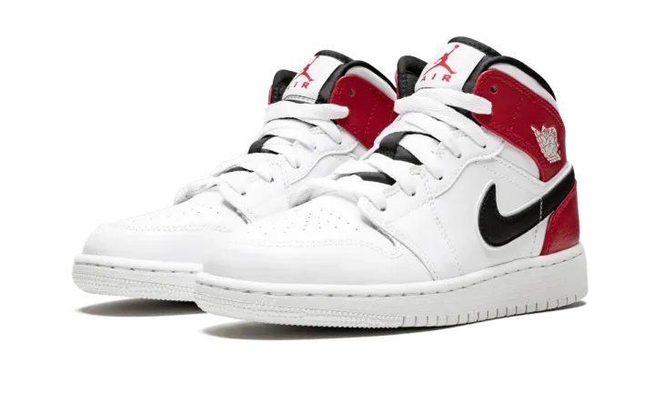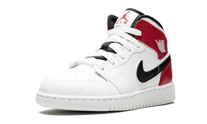 The Air Jordan 1 Mid GS offers premium comfort and full-court style for the young kids. Available in grade school sizes, genuine leather and synthetic materials create the sturdy upper of the primarily white Jordan 1. The red heel and black Swoosh add a nod to Michael Jordan's Chicago Bulls team colors. A cupsole construction provides low-profile support and a solid rubber outsole aides the natural motion of your foot.