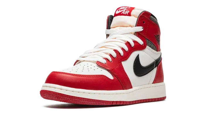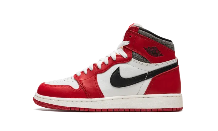 The Air Jordan 1 High OG GS "Lost and Found" is the youth sizing of the re-released original colorway of the retro basketball shoe that draws inspiration from the model's vintage 1985 pairs. The "Lost and Found" replicates the look and feel of the debut version of the "Chicago" from the '80s. It features accurate-to-original panel shapes and colors, and an aged, vintage look. Inspiration for the theme comes from the hunt of finding the original Jordan 1 "Chicago" in mom and pop sneaker shops years after the shoe debuted. The perforated toe and mid-panel are designed in white leather. The neutral base is accented by red leather overlays. A black leather Swoosh appears on both sides of the shoe. Classic "Nike Air" and Swoosh branding can be found on the red nylon tongue tag. Underfoot, a white midsole and black rubber outsole complete the look.