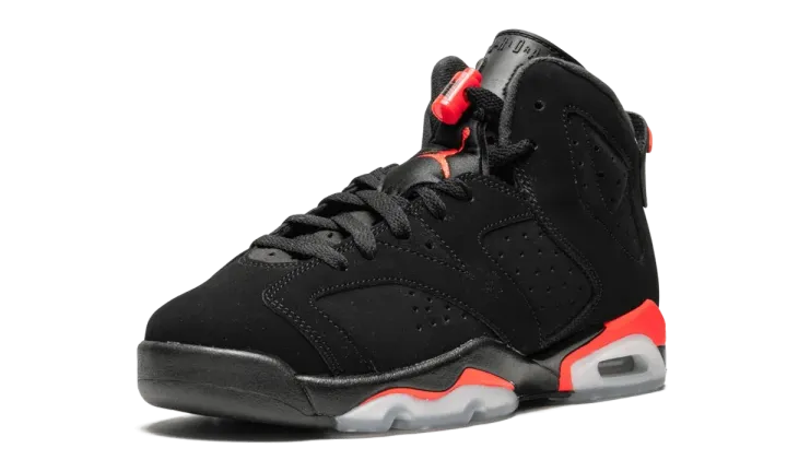 The Air Jordan 6 GS "Black/Infrared 2019" is the kids' grade school sizing for the iconic original colorway of the sixth Air Jordan. This 2019 retro of the famous "Black/Infrared" Jordan 6 originally worn by Michael Jordan in 1991 features period correct details, including the Nike Air logo embroidered in black on the heel, to go along with the black nubuck upper, neon red accents, and icy clear portions of the outsole. The Air Jordan 6 GS "Black/Infrared 2019" for kids released during NBA All-Star Weekend on February 16, 2019.