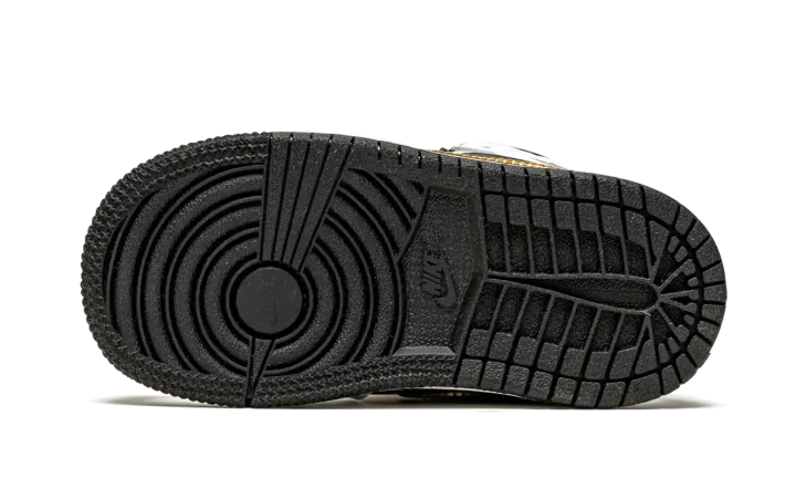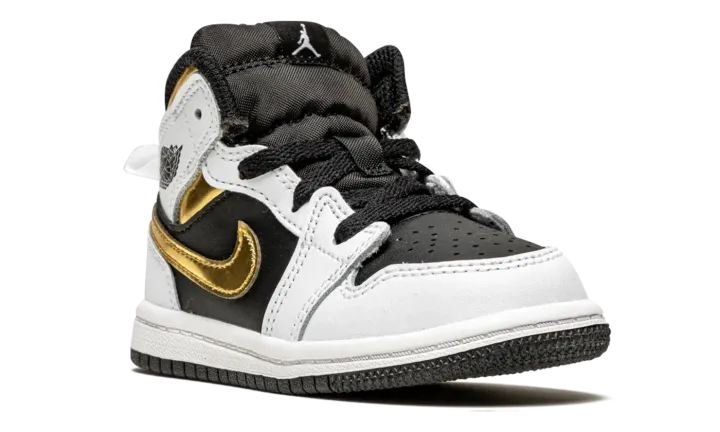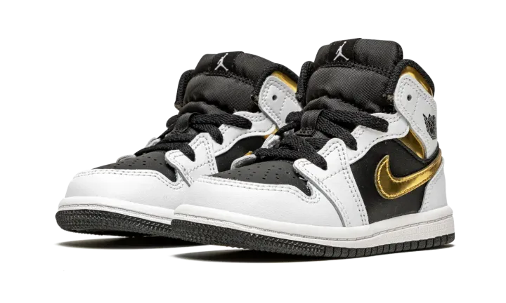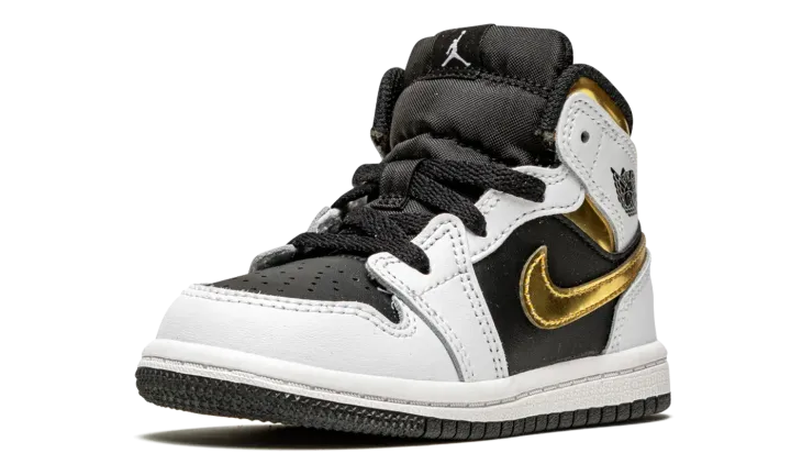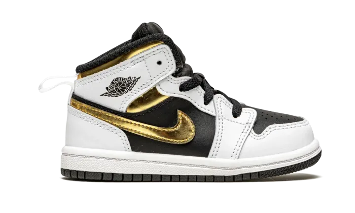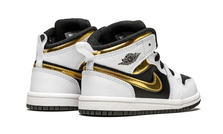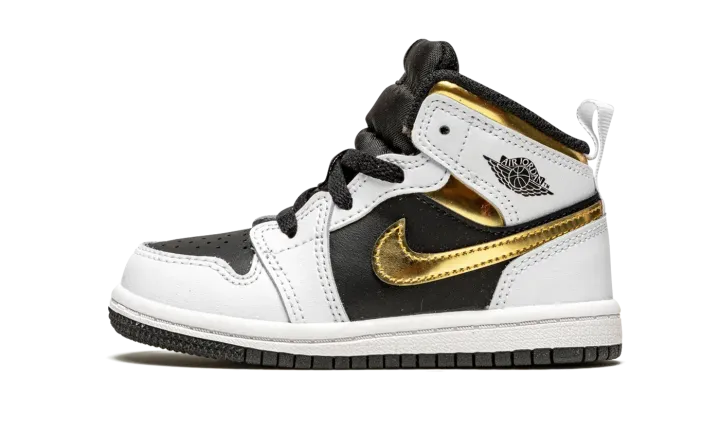 The Jordan 1 Mid TD "White/Gold" brings an opulent look to the toddler version of Michael Jordan's first signature shoe. A combination of white leather on the forefoot, eyelets, collar, and heel and black leather on the perforated toe and mid-panel highlights the base of the shoe. From there, Jordan Brand gets creative by outfitting the model with a metallic gold leather Swoosh on both sides and metallic gold on the collar. A black "Wings" logo appears on the white leather overlay on the collar and a small white Jumpman on the tongue tag. Additional details include a black nylon tongue with matching black laces and a white nylon pull tab on the heel. A two-tone white rubber midsole and black outsole puts the exclamation point on yet another classic-looking Air Jordan 1.
