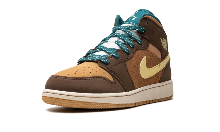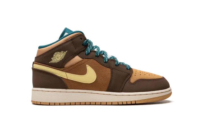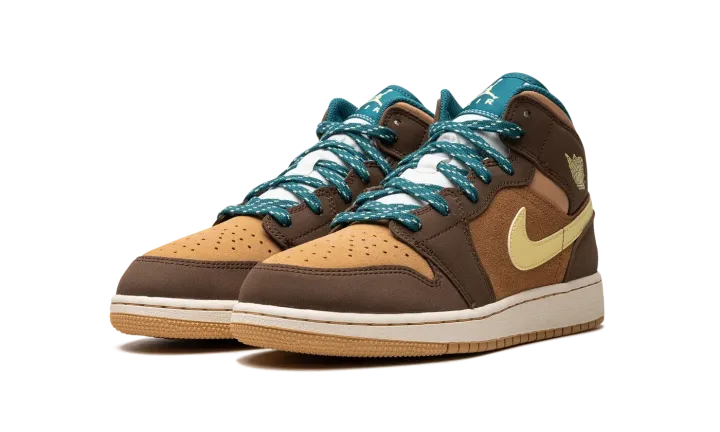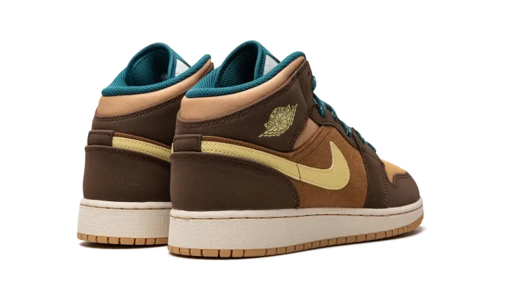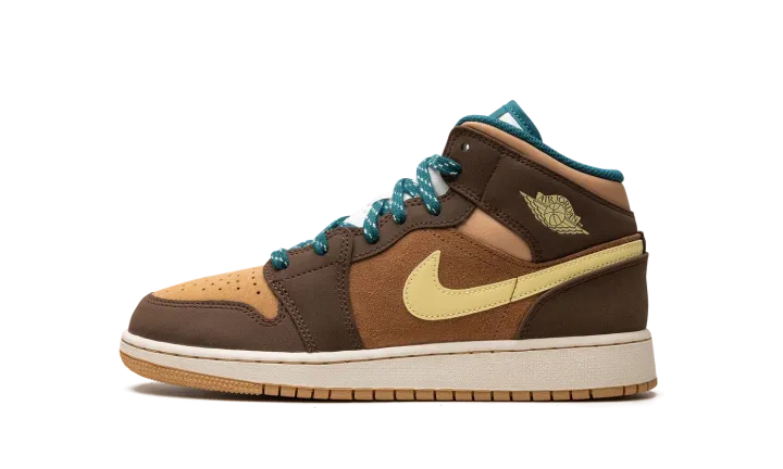 The Air Jordan 1 Mid GS "Cacao Wow" is the youth sizing of the lifestyle shoe with a unique, head-turning color scheme. The upper is complete with a light and dark suede base with Cacao Wow-colored synthetic nubuck overlays. A pastel yellow-colored leather Swoosh and "Wings" logo appear on either side of the shoe and collar, respectively. Geode Teal accents appear on the laces, inner lining, and tongue. Release date: September 12, 2023