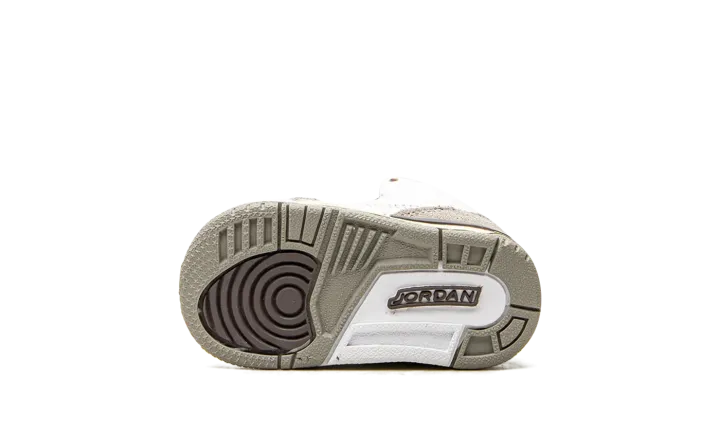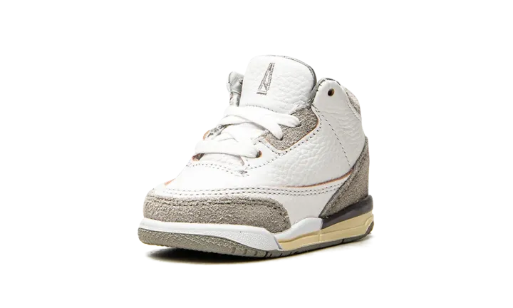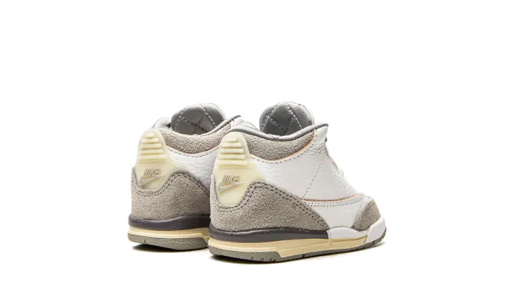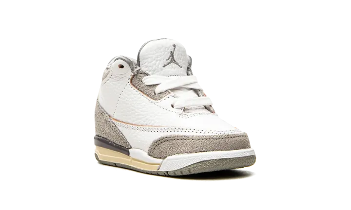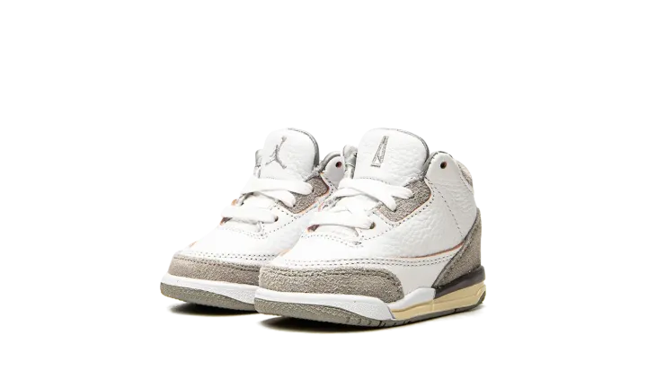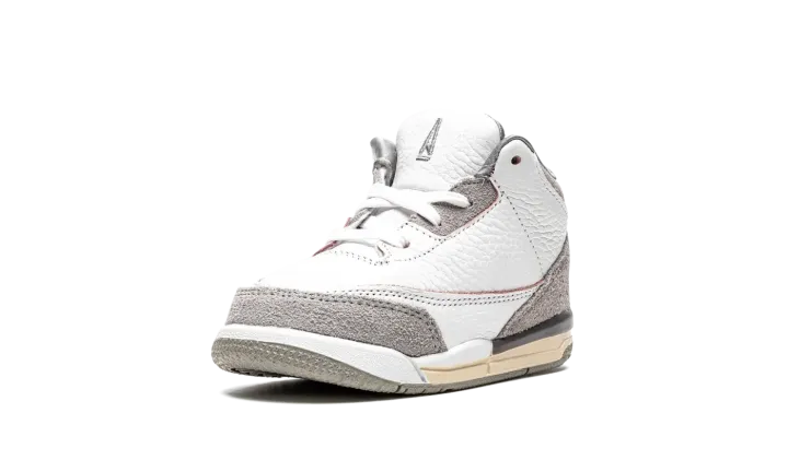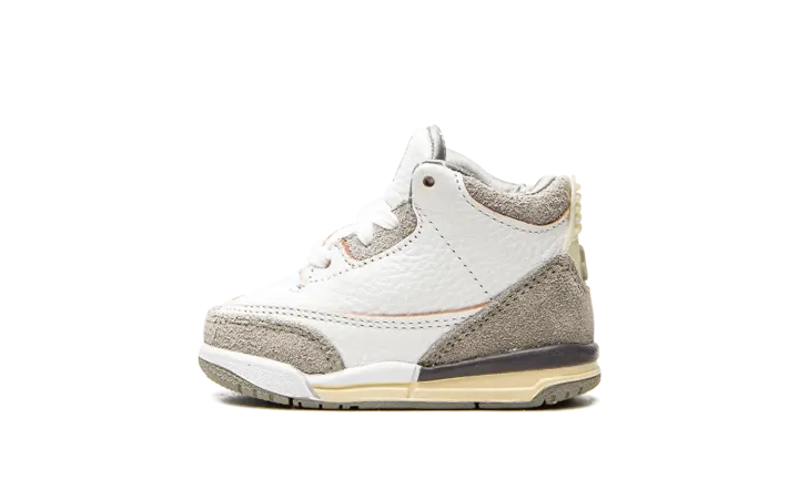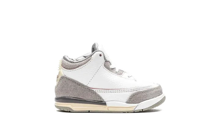 The A Ma Maniere x Jordan 3 TD "Raised by Women" is the toddler sizing of the collaboration between the Atlanta based retailer and Jordan Brand on Michael Jordan's third signature shoe. A Summer 2021 release, the "Raised by Women" is A Ma Maniere's first collaboration with Jordan Brand following its popular "Hand Wash Cold" collection with Nike in 2019. Decidedly vintage-looking, the "Raised by Women" is an ode to A Ma Maniere owner James Whitner's relationship with his mother, specifically the first shoe she bought Whitner as a kid, which was the Jordan 3. The white tumbled leather upper is matched to a buttery grey suede material on the toe, eyelets, collar, and heel. Cream accenting on the lace holes and heel counter with the Jordan 3's original "Nike Air" branding mimic the look of design elements that have undergone the process of oxidation. The midsole is painted a shade of Violet Ore and dual A Ma Maniere and Jumpman insignia highlight the left and right tongues, respectively.
