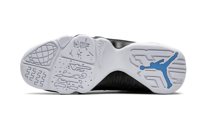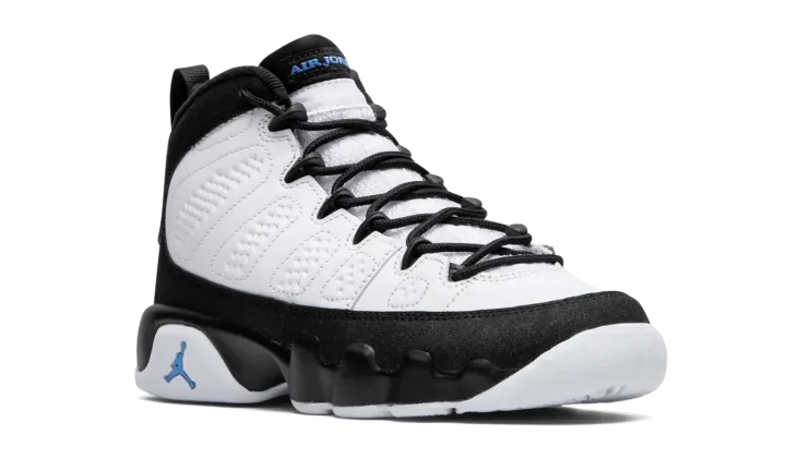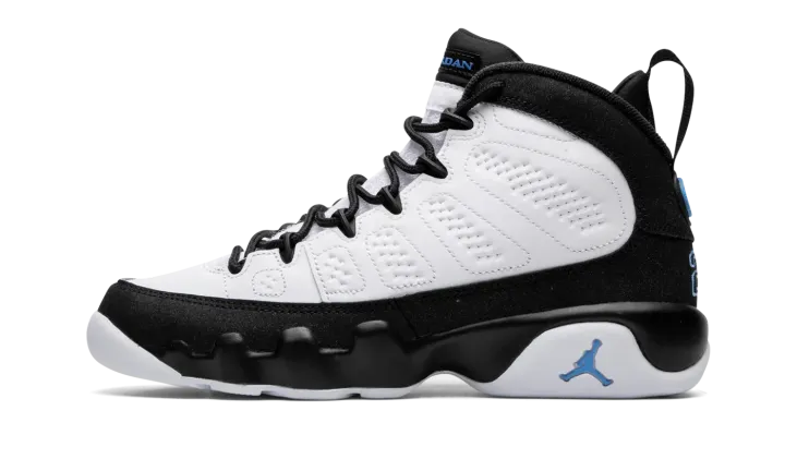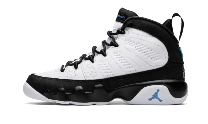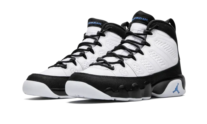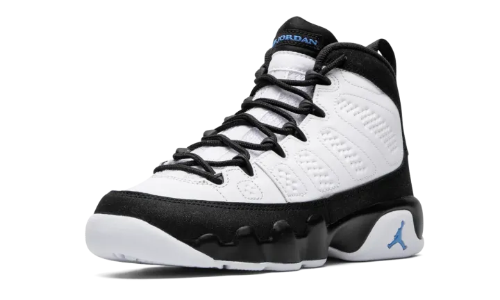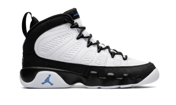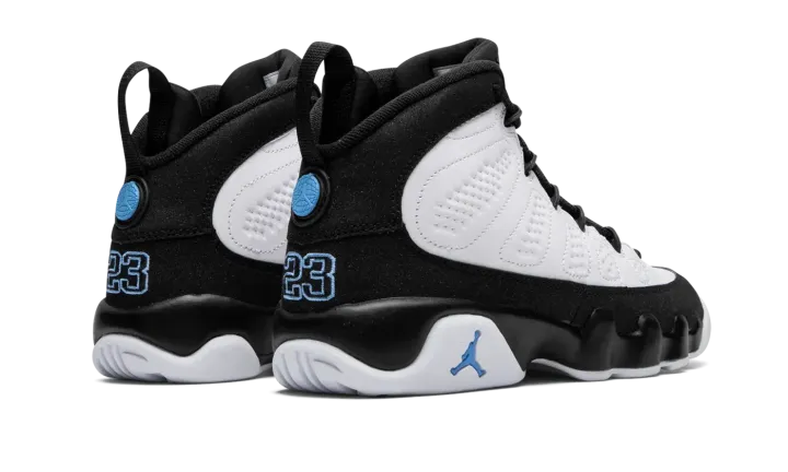 The Air Jordan 9 GS "University Blue" is the youth sizing of Michael Jordan's ninth signature shoe in a UNC-inspired colorway for Winter 2020. The "University Blue" look features the familiar original white and black color block of the Jordan 9, but with University Blue replacing the red accents. The colorway includes a white leather base with a perforated "diamond" motif appearing along the medial and lateral sides of the shoe. A black synthetic nubuck mudguard above the black painted midsole breaks up the look. Black plastic eyelets and rope laces contrast the white mesh tongue. A University Blue "23" emblem appears on the heel and "Air Jordan" detailing dots the tongue. Additional "UNC" inspired accenting can be found on the mini Jumpman emblem on the sole and on the "globe" insignia on the heel. A black nylon pull tab on the heel and inner bootie lining complete the look of the shoe. Release date: December 5, 2020.