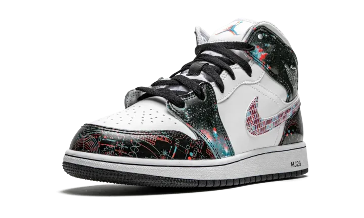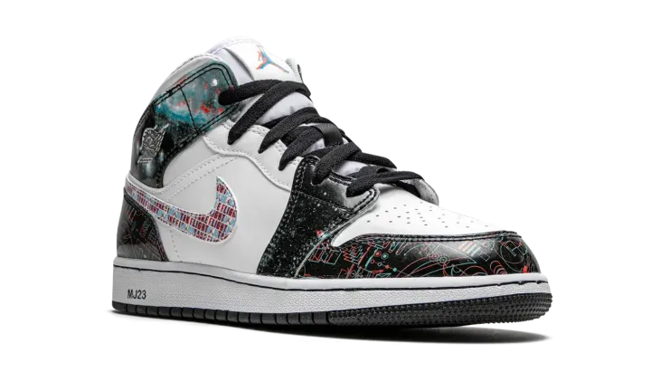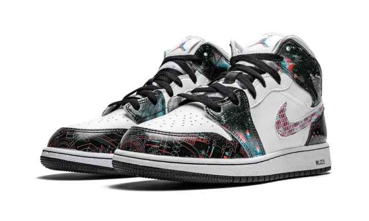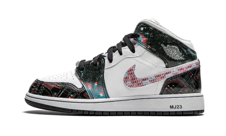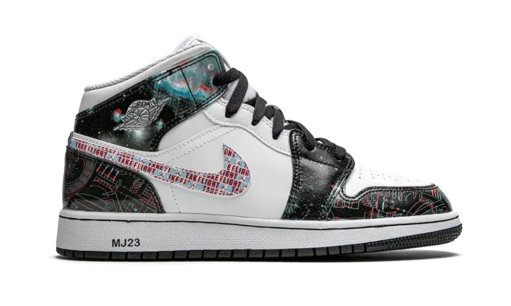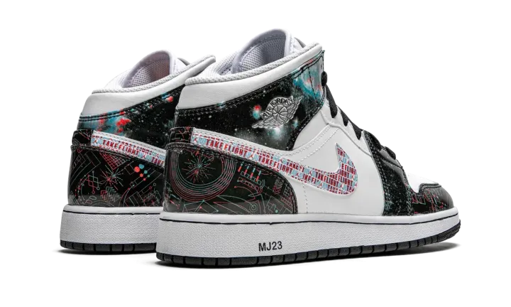 The Air Jordan 1 Mid SE GS "Take Flight" is a special 3D graphic colorway of Michael Jordan's first signature shoe that was released exclusively in kids sizing. Inspired by the effects of 3D glasses, the "Take Flight" cuts a futuristic look, beginning with the design of the outer space-like leather overlays on the upper. The phrase "Take Flight" is inscribed within the Swoosh branding layered over the white leather mid-panel. A silver metallic "Wings" graphic appears on the collar and trippy three-dimensional Jumpman branding adorns the top of the white mesh tongue. In an interesting move, Jordan Brand prints "MJ23" text on the heel of the white midsole in reference to the team jersey number worn by "Money" during his basketball career.