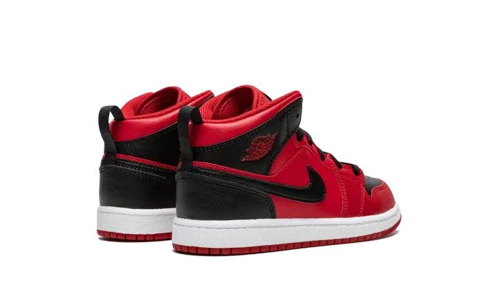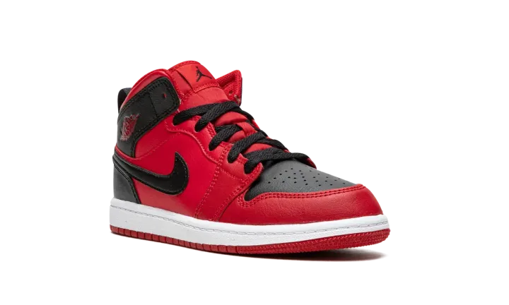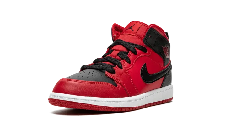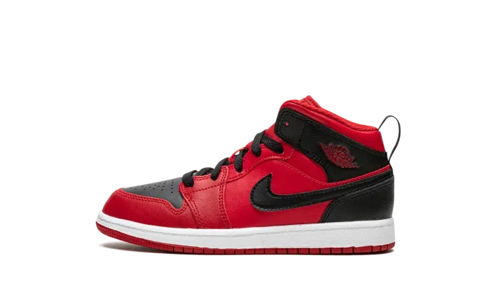 The Jordan 1 Mid PS "Reverse Bred" is the preschool sizing of the popular mid-top lifestyle shoe in a colorway that rearranges the original "Bred" Air Jordan 1 style. The original "Bred" colorway was released back in 1985, and serves as the inspiration for the "Reverse Bred" that, as its name implies, reversed the design's black-and-red look. The perforated toe, collar, and heel appear in black leather. Contrasting Gym Red leather is found on the overlays and on the mid-panel. A black leather Swoosh is located on either side of the shoe and a red "Wings" logo resides on the collar. Additional branding appears in the form of a black Jumpman on the tongue tag of the Gym Red-colored nylon tongue. A pull loop on the heel assists with easy on/off wearability.