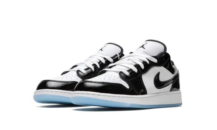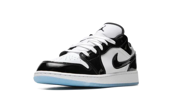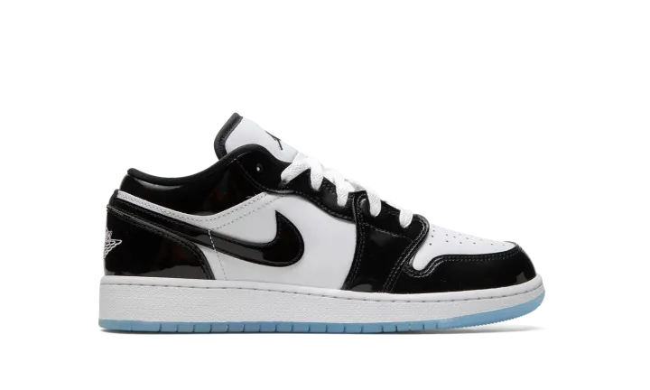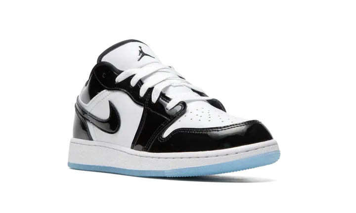 The Air Jordan 1 Low SE GS "Concord" is the youth sizing of the popular low-top sneaker that draws inspiration from the Air Jordan 11's original colorway. Based on the iconic "Concord" Jordan 11, the Jordan 1 Low SE GS features a white leather base with contrasting black patent leather overlays and Swoosh branding. White "Wings" detailing is embroidered on the back of the shoe. A black Jumpman is found on the white nylon tongue. Underfoot, the icy blue translucent outsole is a nod to the design of the Jordan 11's "Concord" colorway.