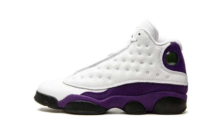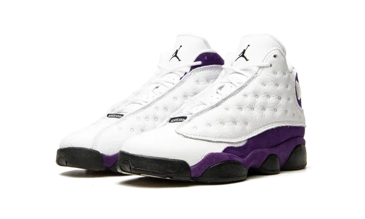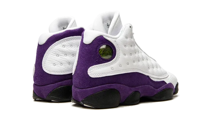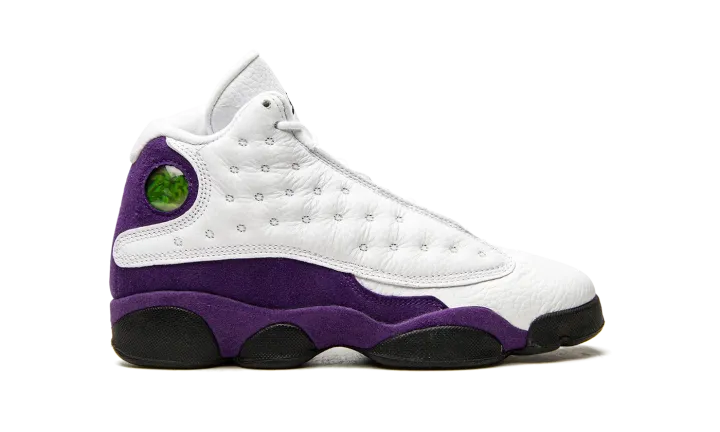 The youth sizing of the Air Jordan 13 "Lakers" is dedicated to Los Angeles Lakers purple and gold uniform colors. Worn by Michael Jordan during the 1997-98 NBA season, his last with the Chicago Bulls, the Jordan 13 model is famous for its of-the-time '90s looks and high-top silhouette. An eye-pleasing purple suede appears on the mudguard and heel while a soft tumbled white leather mid-panel offers a solid base allowing for the purple suede to pop. Details unique to the Air Jordan 13 include the signature circular holographic logo on the collar, a black Jordan tag on the forefoot, and a black embroidered Jumpman logo on the tongue. The grade school sizing of the Air Jordan 13 "Lakers" was released on July 19th, 2019.