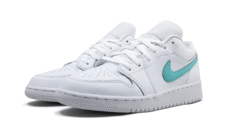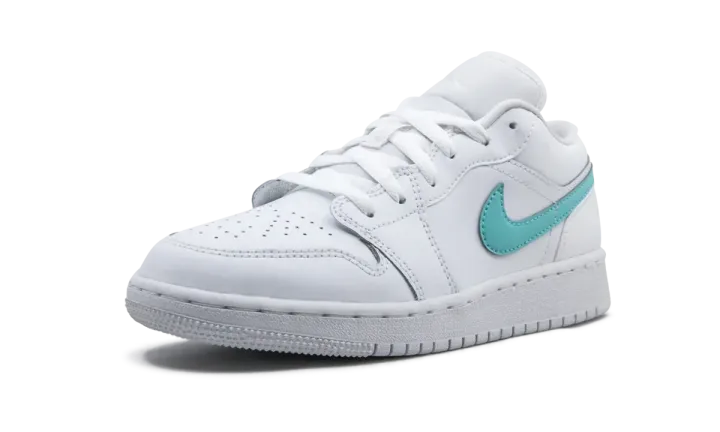 The Air Jordan 1 Low GS "Multicolor Swoosh" is the youth sizing of Michael Jordan's first signature shoe in an appealing colorway for children. Timeless and versatile, the Jordan 1 Low is one of the most popular silhouettes under Jordan Brand's umbrella of footwear classics. Here, the "Multicolor Swoosh" features super crisp white leather detailing on the perforated toe, mid-panel, collar, and heel. As its name suggests, this shoe displays different colored leather Swooshes. The left shoe features a Light Aqua leather Swoosh on the outside and yellow leather Swoosh hit on the medial side. The right shoe displays pink and neon green Swooshes on the outside and inside of the shoe, respectively. Tonal Jumpman embroidery can be found on the white nylon tongue. A white nylon tongue and white "Wings" branding on the heel complete the appearance of this Jordan 1 Low in youth sizing.