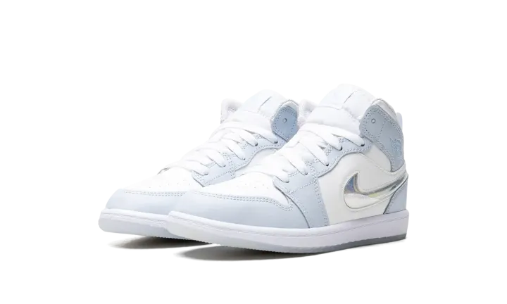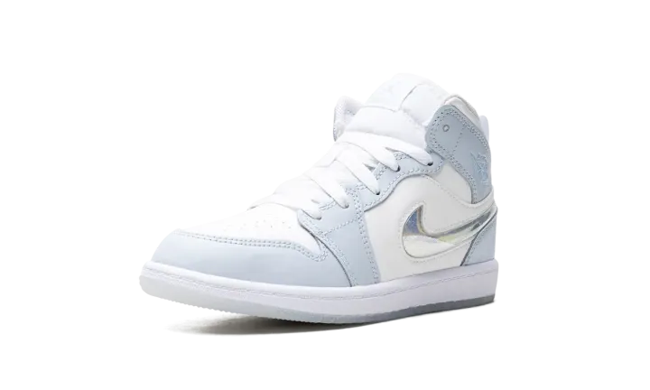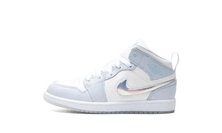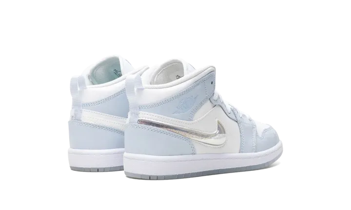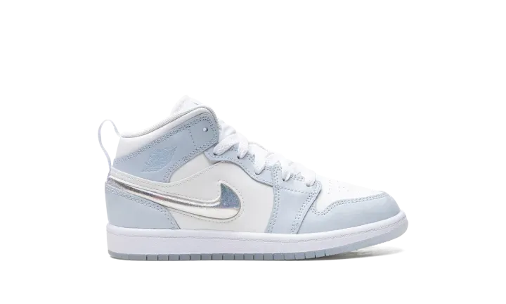 The Air Jordan 1 Mid PS "Glitter Swoosh" is the preschool sizing of the shoe with a winter-inspired design. The upper is complete with a Summit White leather construction with Blue Tint leather overlays. The Swoosh on the lateral side is constructed in clear plastic with glitter that can move around inside it for a unique and fun look inspired by snow globes. A light blue "Wings" logo can be found on the collar, while a Jumpman appears on the tongue tag. Underfoot, a white midsole and icy blue translucent outsole complete the winter theme. Release date: November 27, 2023