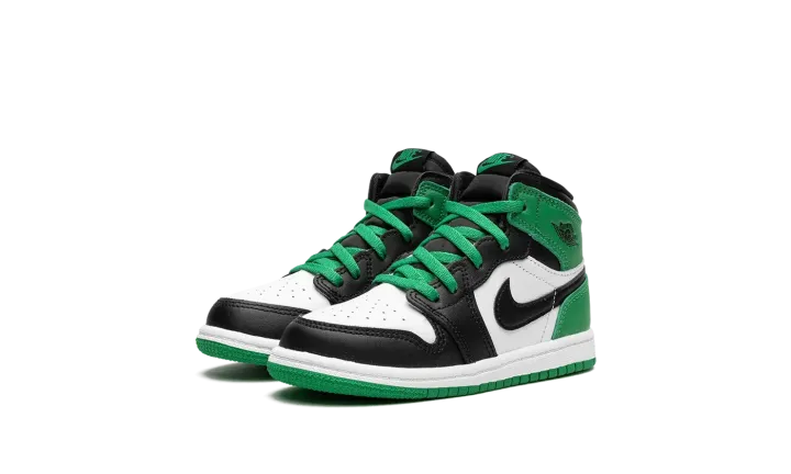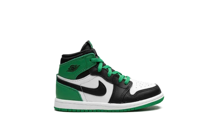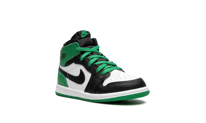 The Air Jordan 1 High TD "Lucky Green" is the toddler sizing of the colorway of the classic basketball shoe that is inspired by the popular "Celtics" style from 2009's "Defining Moments Pack." Although not identical to the Air Jordan 1's "Celtics" colorway from the aforementioned collection, the "Lucky Green" is nonetheless similar to the design. The shoe features a white leather base with contrasting black leather overlays on the toe cap, forefoot, and eyelets. Lucky-Green-colored leather appears on the heel and on the collar. A black leather Swoosh is found on either side of the shoe. Like the "Celtics" Jordan 1 from 2009, the "Lucky Green" features green laces. Where the shoes differ, though, is on the tongue. The "Lucky Green" has Nike branding whereas the "Celtics" colorway dons a Jumpman logo. Release date: April 15, 2023