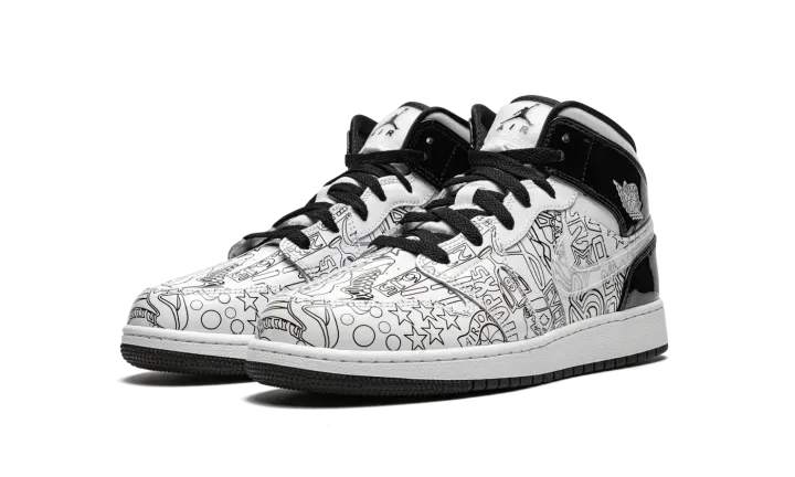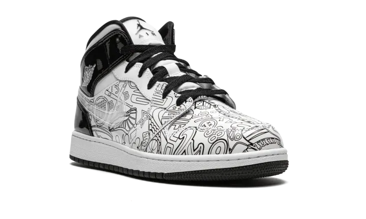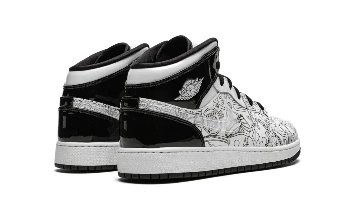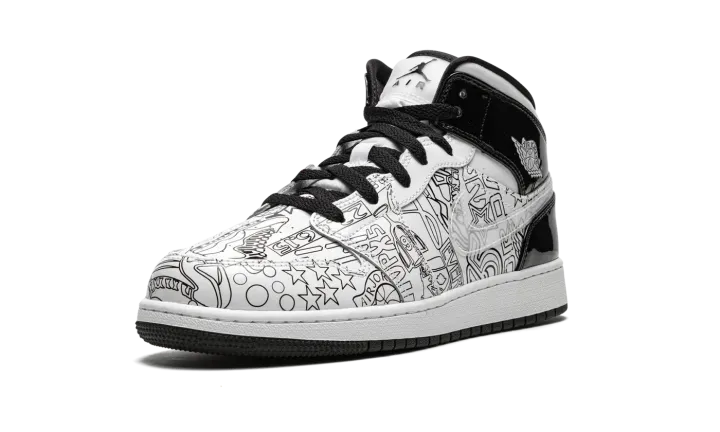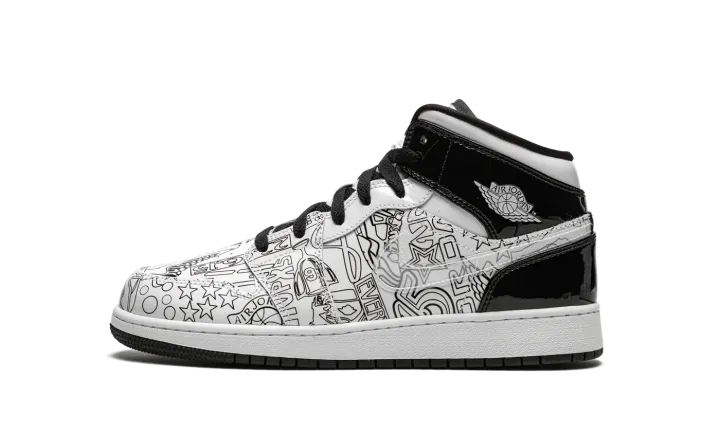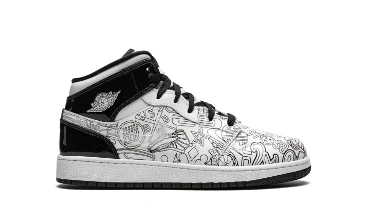 The Air Jordan 1 Mid SE GS "DIY" is a kids-exclusive version of the mid-top silhouette that features a "do-it-yourself" inspired colorway with abstract imagery. The "DIY" version of Michael Jordan's first signature shoe in the mid-top edition includes a crisp white tumbled leather upper with pen-like imagery on the sides and toe, which Jordan Brand encourages the wearer to color in as they see fit, thus the "do-it-yourself" nickname. Black patent leather appears on the collar and heel. A white ball-and-wings logo graces the collar and a black Jumpman with "Air" branding appears on the tongue tag. Underfoot, a two-tone, white midsole and black rubber outsole complete the shoe's look.