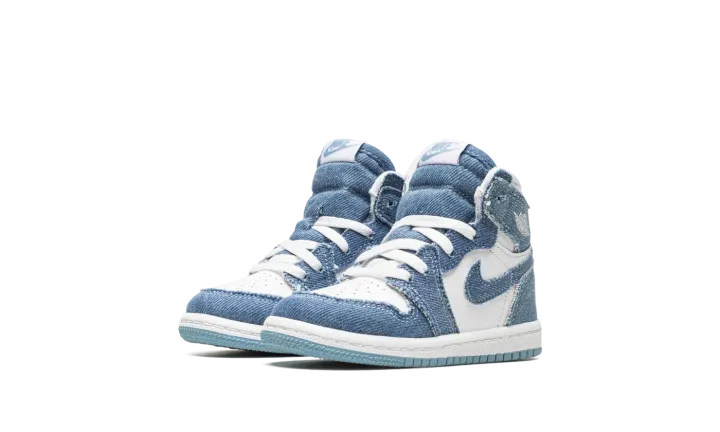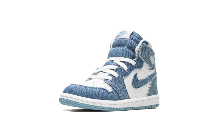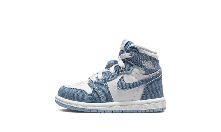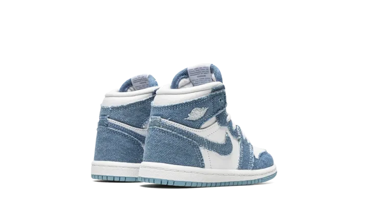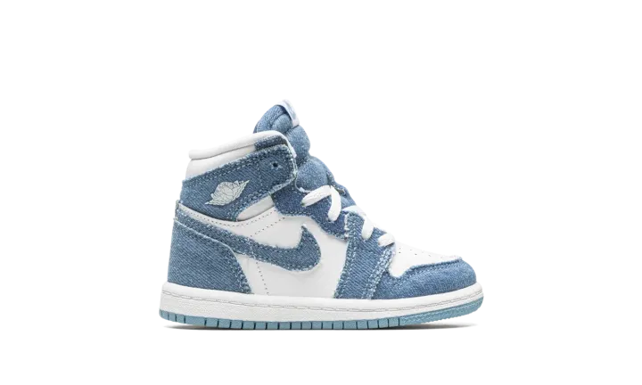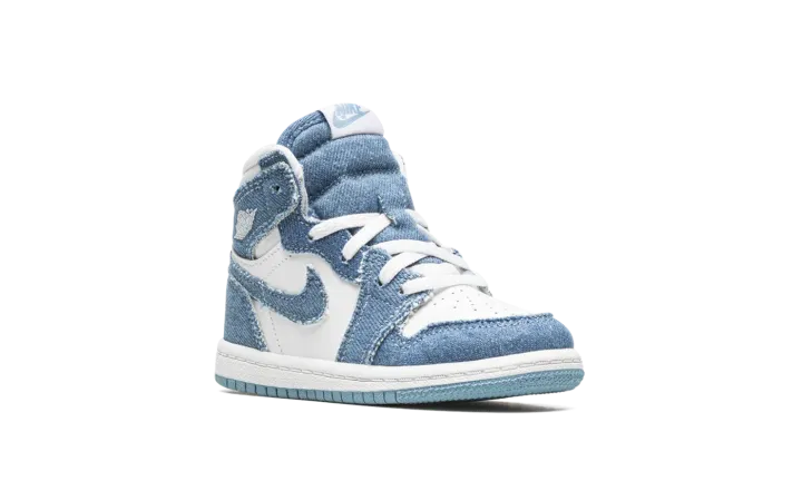 The Air Jordan 1 High OG TD "Denim" is the toddler sizing of Michael Jordan's first signature shoe in a denim-constructed colorway. The "Denim" makeup of the vintage basketball shoe features an eye-catching design with frayed denim overlays against a white leather base. The perforated toe, mid-panel, and collar appear in white leather while the overlays and Swoosh are designed in the aforementioned denim construction with rough edges.