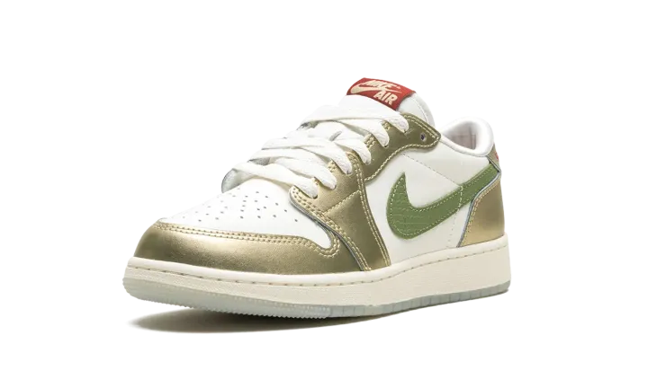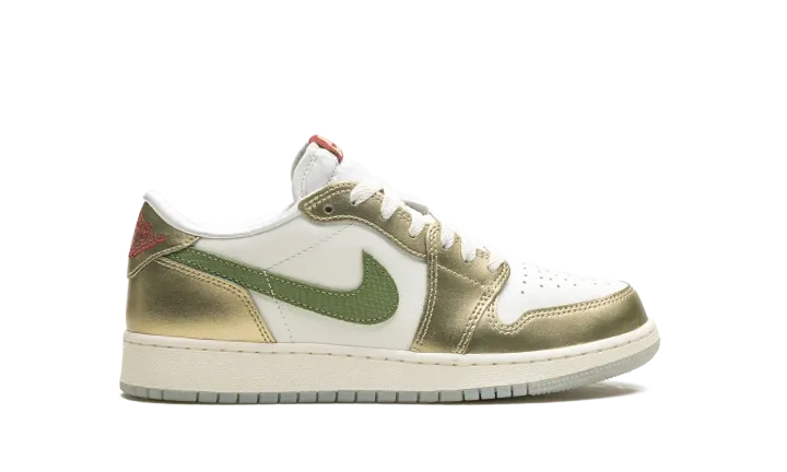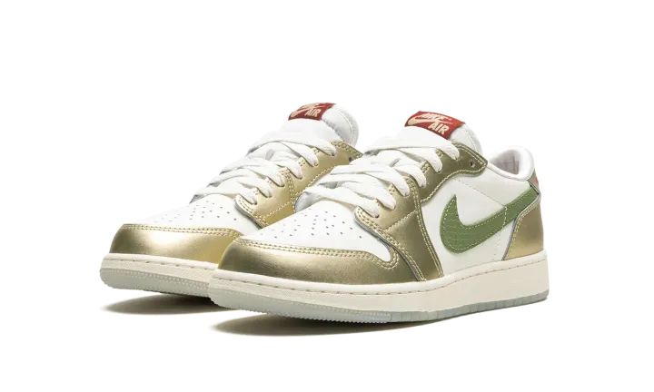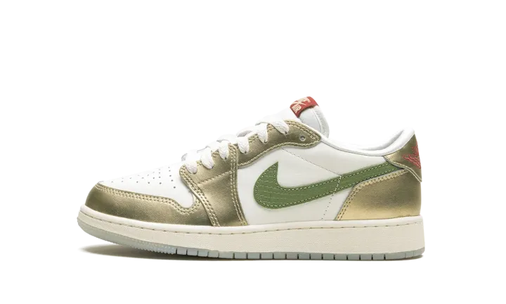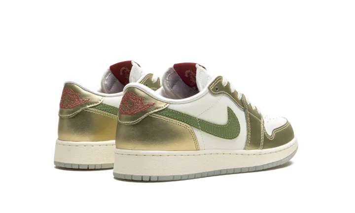 The Air Jordan 1 Low OG GS "Year of the Dragon" is the youth sizing of the retro basketball shoe inspired by the traditional Chinese holiday. From a collection of "Chinese New Year" or "Lunar New Year" colorways by Jordan Brand and Nike, the Jordan 1 Low OG "Year of the Dragon" celebrates the Chinese holiday in 2024 with unique design details. The upper has a Sail leather base with flashy Metallic Gold overlays, and a green scaled Swoosh that pays homage to the revered dragon in Chinese culture. Red "Wings" detailing can be found on the Metallic Gold leather heel tab. More Dark Red accenting appears on the tongue tag with "Nike Air" branding. Release date: January 24, 2024