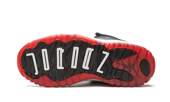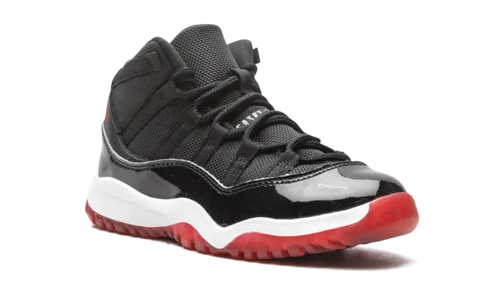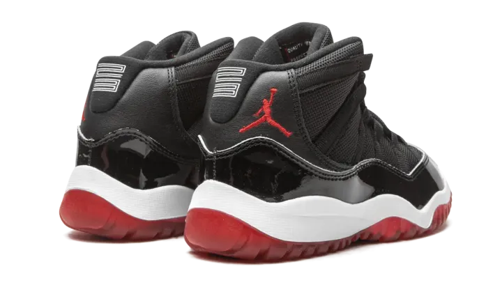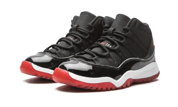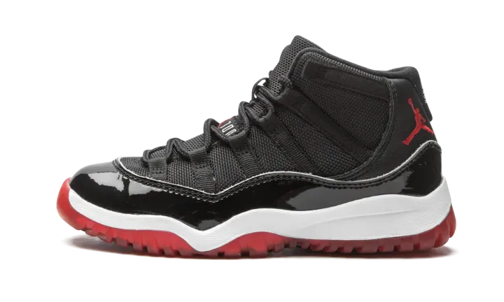 The Air Jordan 11 PS "Bred 2019" is the preschool sizing of the Winter 2019 release of Michael Jordan's iconic eleventh signature shoe. The legendary Air Jordan 11 "Bred" colorway is widely considered one of the greatest colorways of any Air Jordan model and without a doubt one of the most influential Tinker Hatfield-designed sneakers of the '90s. Opulent black patent leather, a signature design element of the Air Jordan 11, wraps around the entire upper while black mesh paneling is located near the eyelets. Tonal leather and an embroidered red Jumpman logo on the heel are true-to-original details of the Air Jordan 11. A nod to Jordan's jersey number "23" covers the heel and a white midsole with a semi-translucent outsole and carbon fiber trim complete this masterpiece. The Air Jordan 11 PS "Bred 2019" in preschool sizing was released on December 14, 2019.