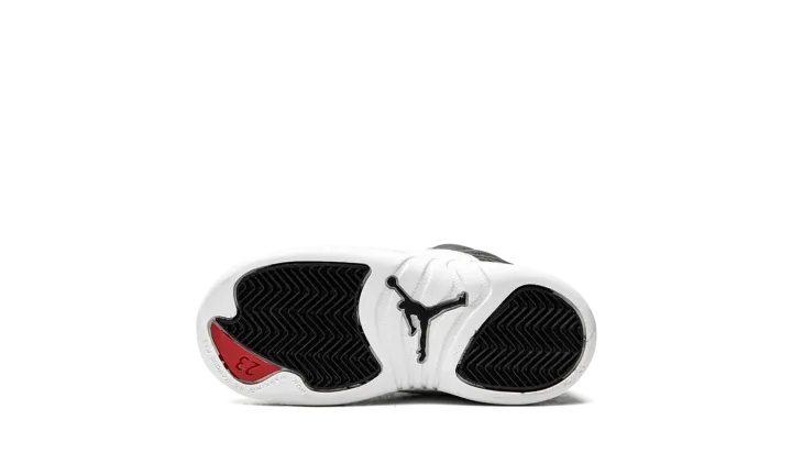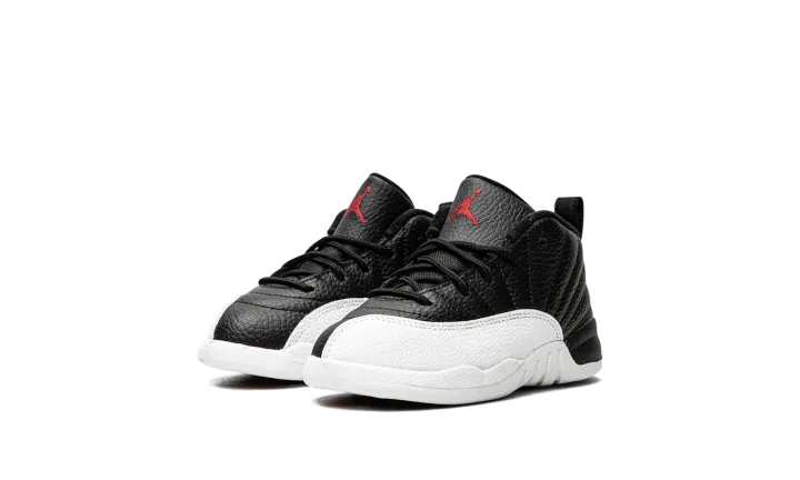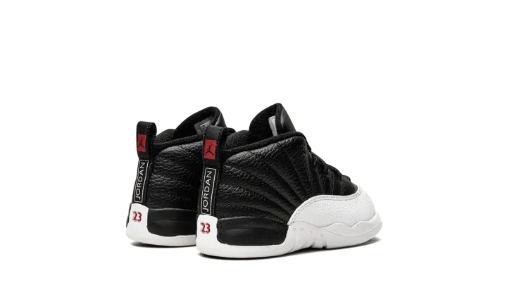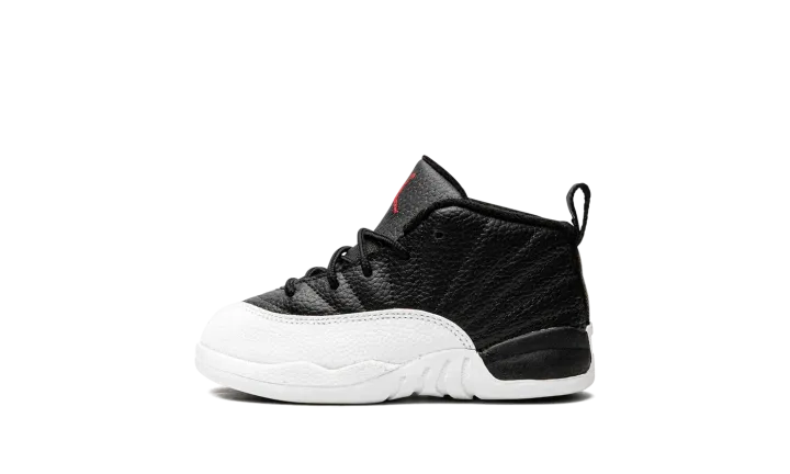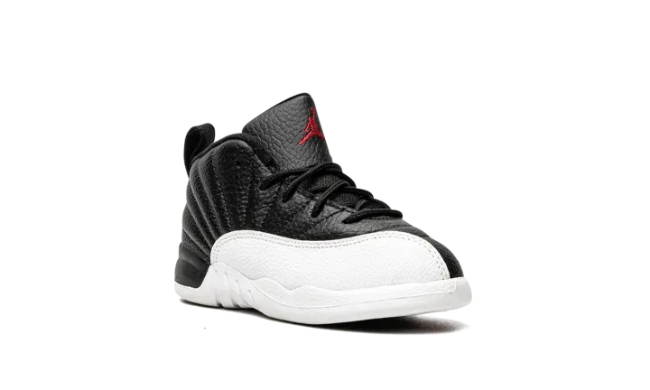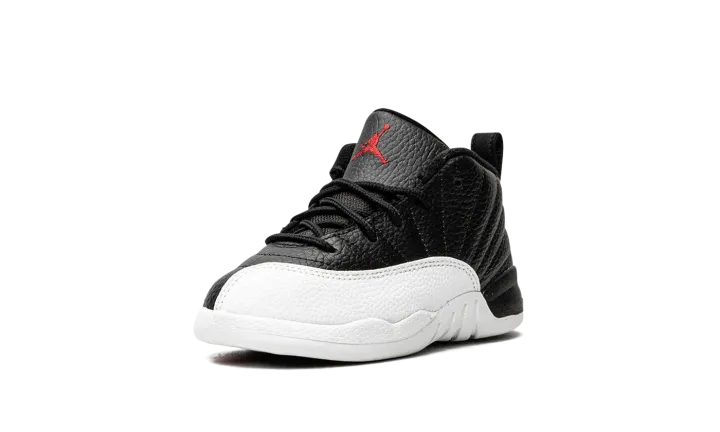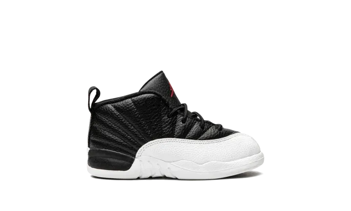 The Jordan 12 TD "Playoffs 2022" is the toddler version of Michael Jordan's retro basketball shoe in an original colorway that Jordan wore during the 1997 NBA Playoffs. The shoe celebrates the black-and-white colorway's 25-year anniversary in spectacular fashion, as the modern incarnation of the shoe is identical to the original version from '97. A black leather upper is paired with textured white leather on the toe, mudguard, and midsole. The black leather tongue displays a red embroidered Jumpman branding. Red "23" and "Jordan" branding can be found on the back of the black rubber midsole and heel, respectively. Release date: March 11, 2022