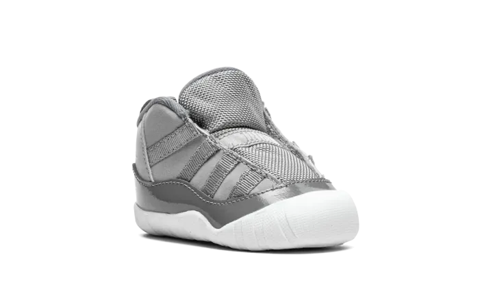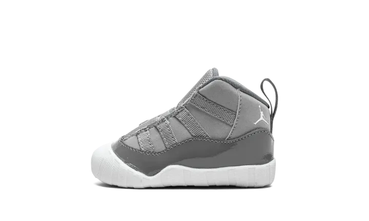 The Jordan 11 Crib Bootie "Cool Grey" is the infant sizing of the popular colorway that debuted in 2001 before returning as a Holiday 2021 release by Jordan Brand. The Air Jordan 11 "Cool Grey" first appeared on sneaker store shelves in March 2001, and was the retro basketball shoe's first non-original colorway. Michael Jordan famously wore the "Cool Grey" regularly with the Washington Wizards in 2001 and 2002, which helped its popularity. Despite being made for tiny feet, the Crib Bootie "Cool Grey" keeps the integrity of the shoe's original design with a nubuck base and patent leather mudguard—both in Cool Grey. A white Jumpman is found on the collar. A nylon pull tab on the heel assists with wearability. The mesh tongue appears in Cool Grey and a white rubber sole completes the look underfoot. Release date: December 11, 2021