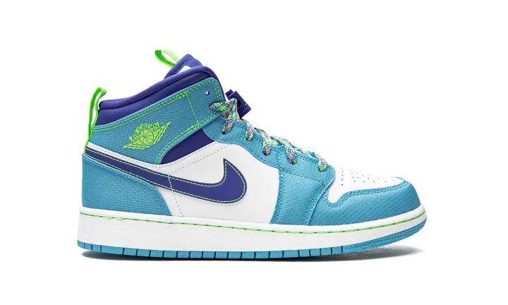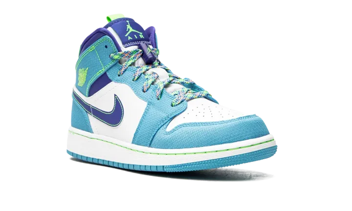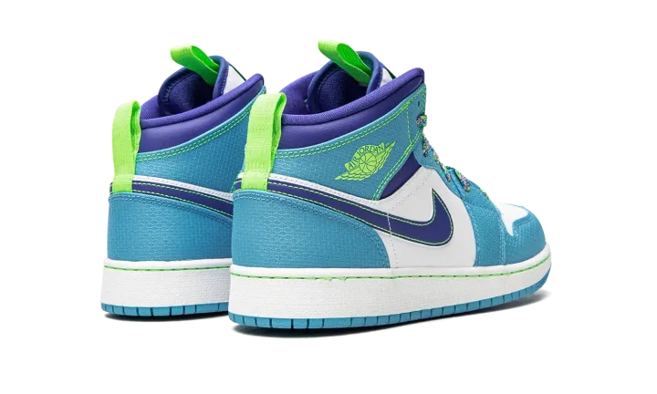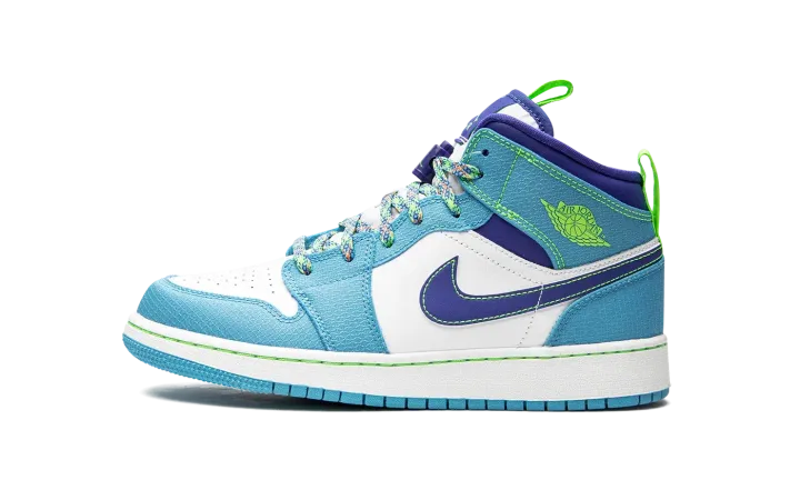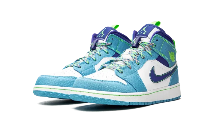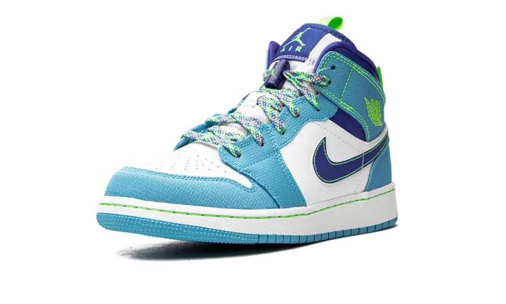 The Air Jordan 1 Mid SE GS "Sprite Blue" is a head-turning colorway of the kids version of Michael Jordan's first signature shoe in the mid-top variation. A perennial favorite among adults and children alike, the Air Jordan 1 Mid is treated to a "Sprite Blue" refresh on this warm look. The perforated toe and mid-panel feature a white leather construction. Dark Powder Neon-colored leather overlays and a Racer Blue leather Swoosh contrast the look of the neutral-colored base. A nylon pull tab on the back of the shoe assists with easy on/off wearability. The classic Wings logo appears in neon green on the collar, as do the Jumpman and "Air" branding on the white nylon tongue tag. Speckled laces and a purple lace toggle with a neon green Jumpman complete the look. Release date: October 5, 2021
