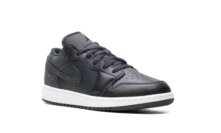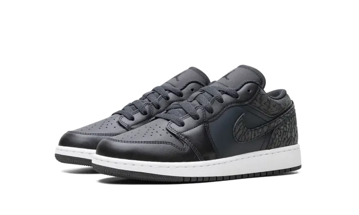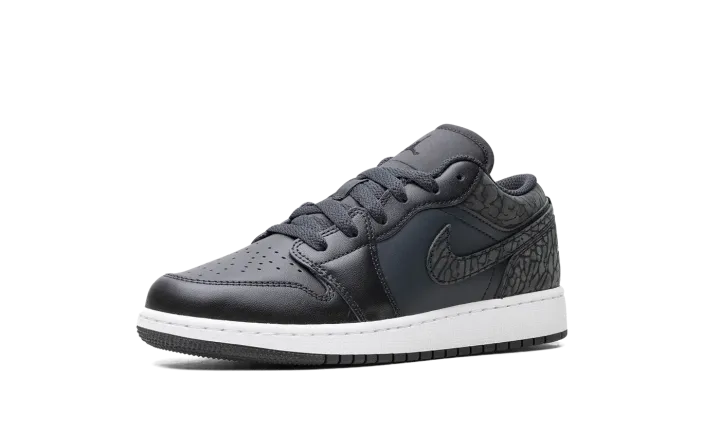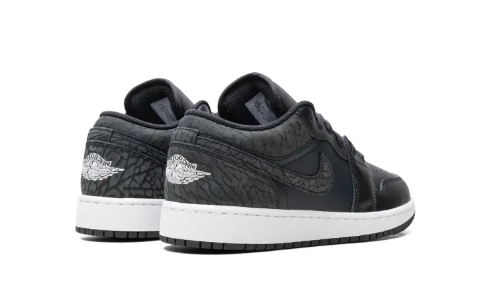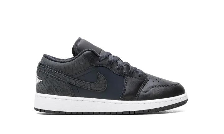 The Air Jordan 1 Low GS "Black Elephant" is the youth sizing of the retro basketball shoe in a colorway with classic Air Jordan detailing. The Jordan 1 Low GS "Black Elephant" features the same elephant patterning that was found on the Air Jordan 3 when it debuted in 1988. The print appears on the black Swoosh logo on either side of the shoe, on the heel, and on the collar. The rest of the shoe features a black leather construction and a black nylon tongue. A black Jumpman is embroidered on the tongue. Underfoot, a white midsole and black outsole complete the look. Release date: October 20, 2023