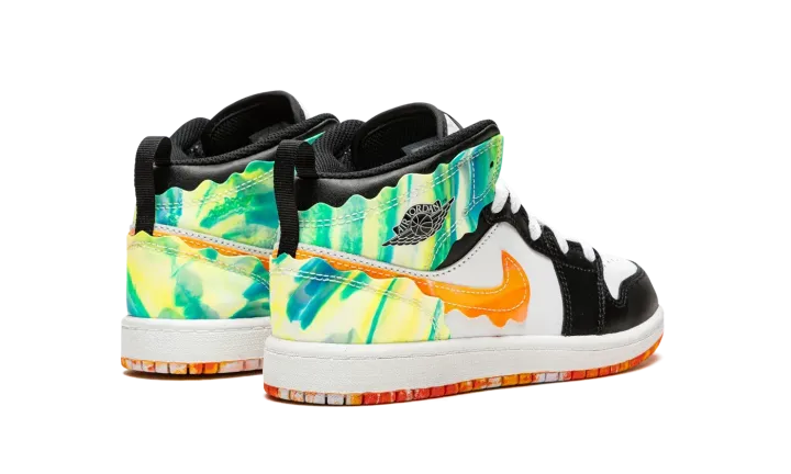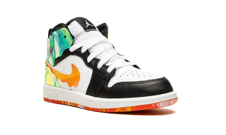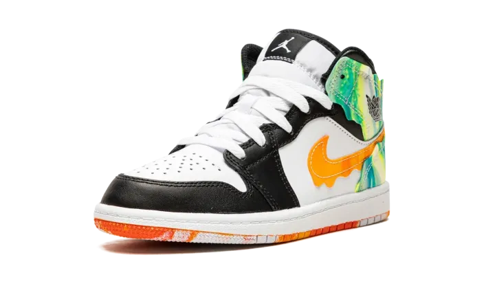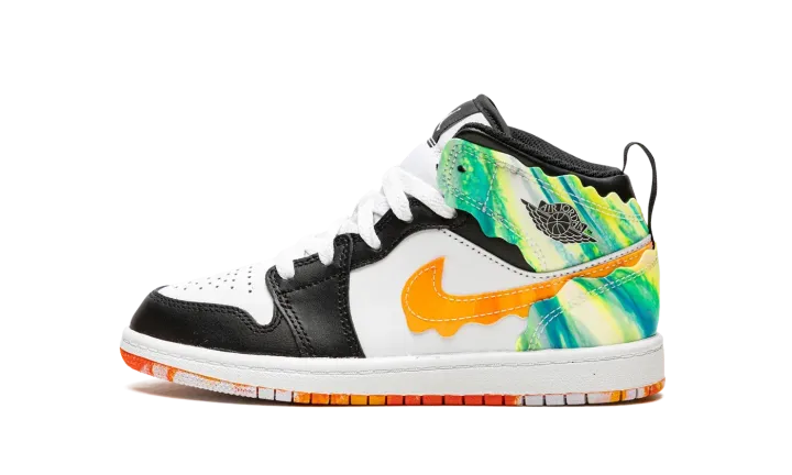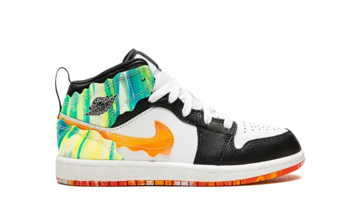 The Air Jordan 1 Mid GS SE "Wavy" is a fun, kids-sized version of the casual lifestyle shoe with colorful wavy panels and branding. A spring and summer-ready look, the "Wavy" Jordan 1 Mid GS features a crisp white leather base with contrasting black leather on the toe cap, forefoot, eyelets, and collar. A wavy Team Orange leather Swoosh is located on either side of the shoe. Both the collar and heel panels feature the same wavy-like cut, and are designed with neon green and yellow swirls in a trippy way. Release date: March 28, 2022