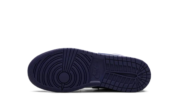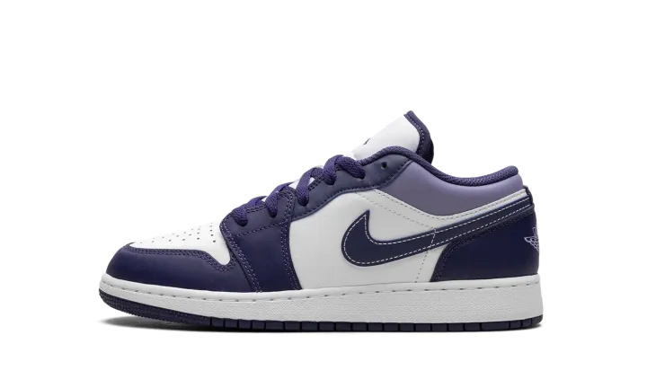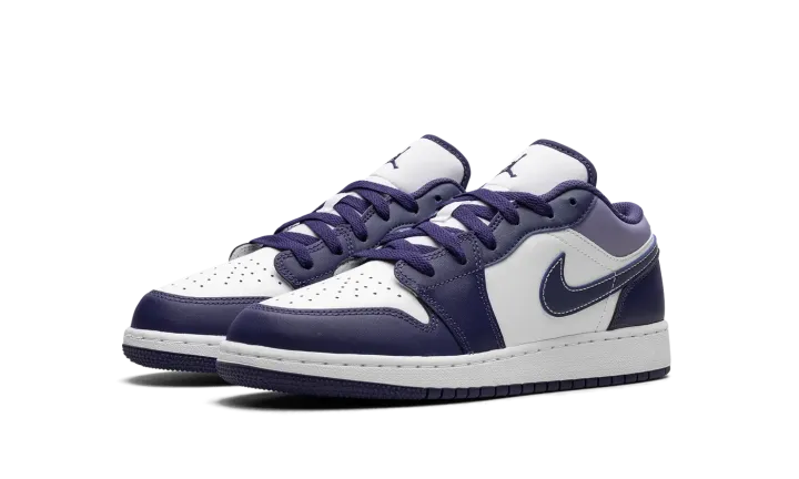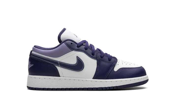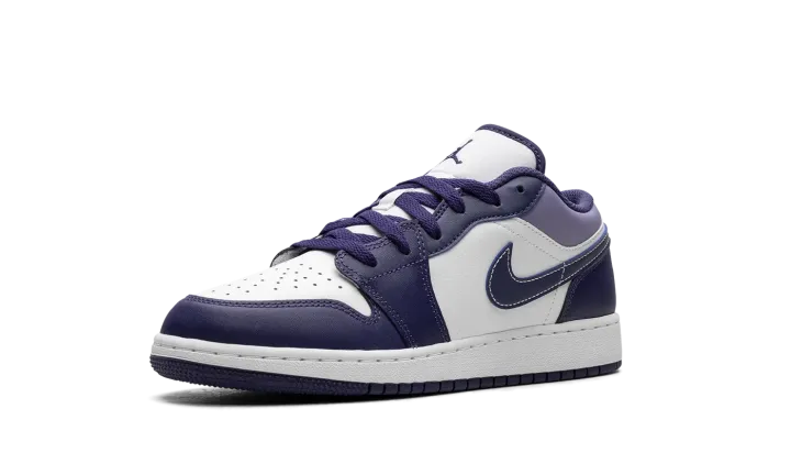 The Air Jordan 1 Low GS "Sky J Purple" is the youth sizing of the colorway of the retro basketball shoe with purple accents. The colorway has a white leather upper with Sky J Purple leather overlays and Swoosh branding. A lighter shade of purple appears on the collar. A classic "Wings" logo is embroidered on the heel while a purple Jumpman is found on the tongue. The shoe's two-tone look continues underfoot with a white rubber midsole and purple rubber outsole. Release date: July 20, 2023
