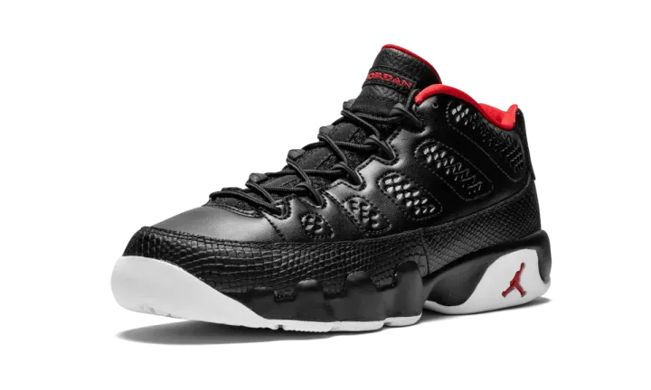 New for 2016 was this colorway of the Air Jordan 9 Low in a black and red color combination that quickly picked up the "Bred" nickname. The all-black upper features a mix of smooth and snakeskin-textured synthetic leather with red accents and a white outsole. This listing is for Grade School sizing.