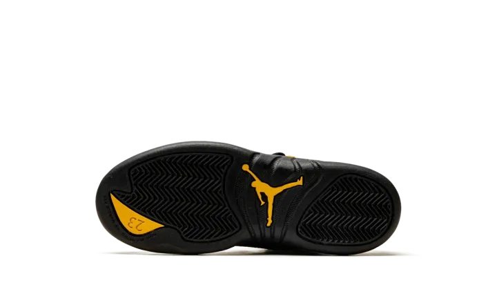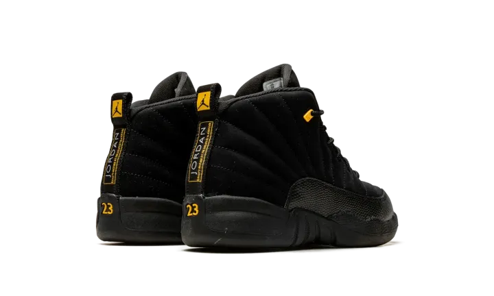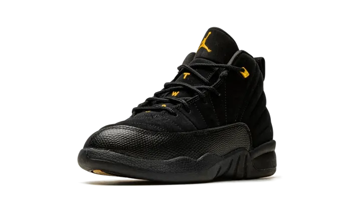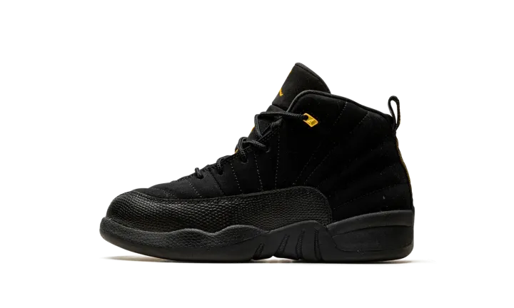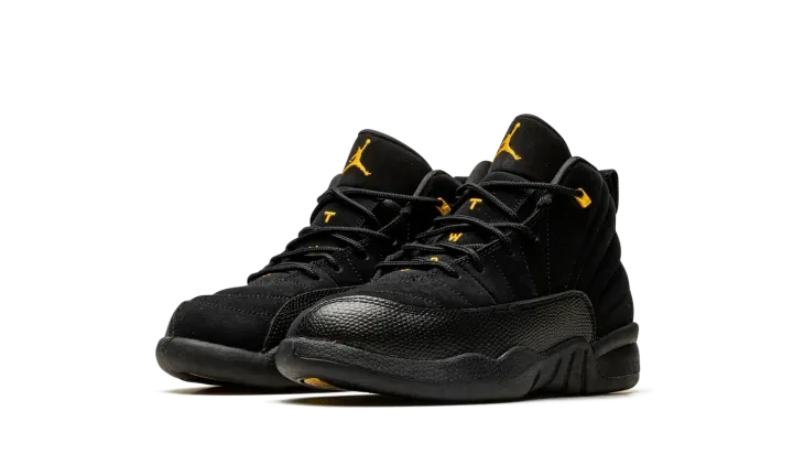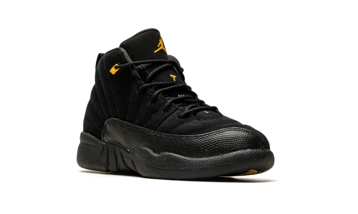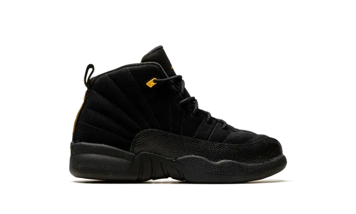 The Air Jordan 12 PS "Black Taxi" is the preschool sizing of the mostly monochromatic black colorway of the retro basketball sneaker that references its original "Taxi" look, but with a twist. The "Black Taxi" updates the Jordan 12's original "Taxi" colorway with black accents in lieu of the "Taxi's" predominantly white upper. The "Black Taxi" features a black leather upper instead of the "Taxi's" white leather construction. A tonal synthetic textured mudguard ties into the colorway's stealthy vibe. "Taxi" yellow accents come into play on the eyelets and on the midfoot overlay with "Jumpman" branding. Additional pops of yellow are found on the embroidered Jumpman and "Two 3" logos on the tongue. The shoe's black foam midsole finishes off the stealthy vibe. Release date: December 3, 2022