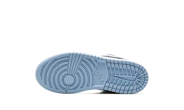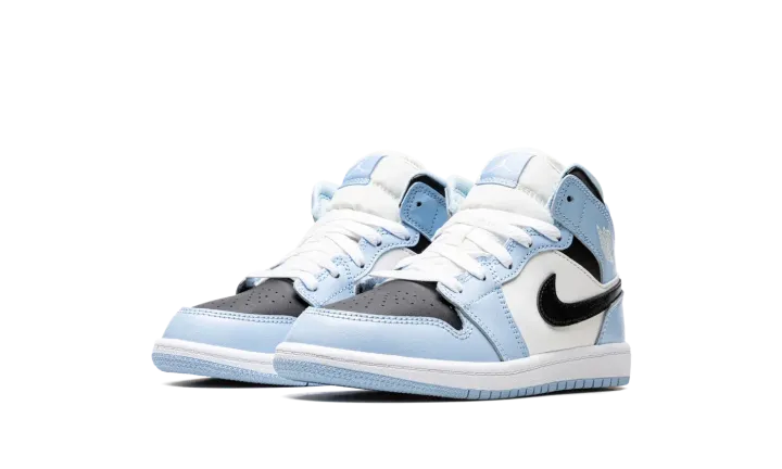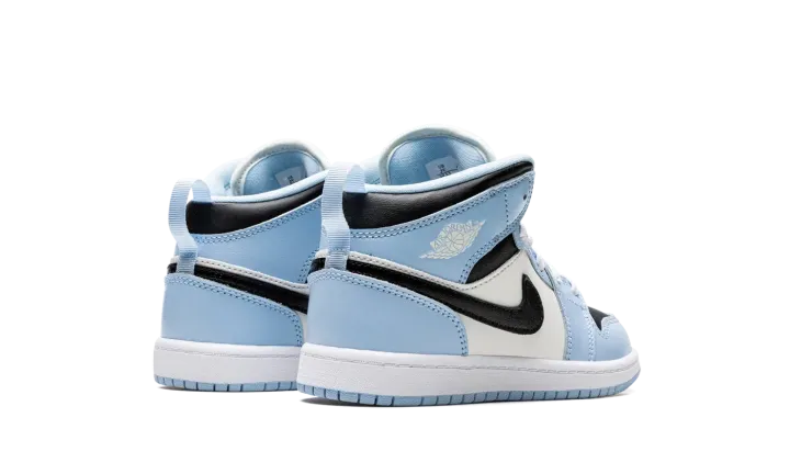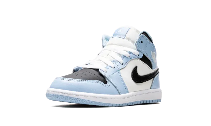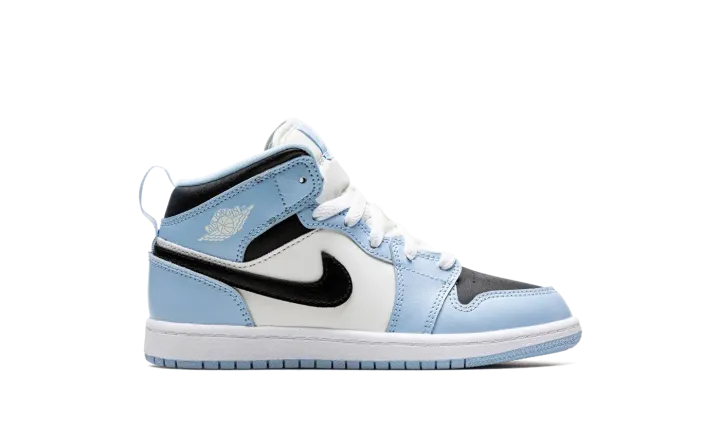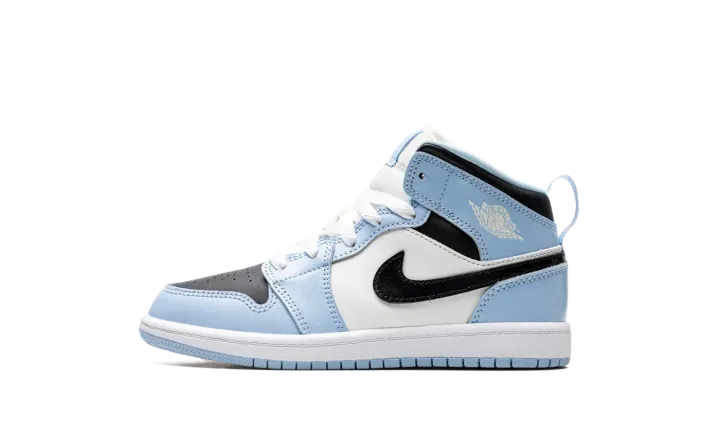 The Air Jordan 1 Mid PS "Ice Blue" is the preschool sizing of the lifestyle sneaker with light blue accents. This Jordan 1 Mid features a slight nod to the University of North Carolina, Michael Jordan's alma mater, with its Ice Blue accents that are loosely inspired by the school's primary color on its team uniforms. The shoe features a black leather perforated toe with Ice Blue leather overlays and a white leather mid-panel. A black leather Swoosh appears on the sides. White "Wings" branding is found on the collar. An Ice Blue pull tab on the heel assists with easy on/off wearability. Release date: September 19, 2022