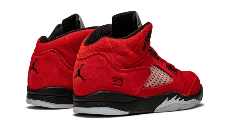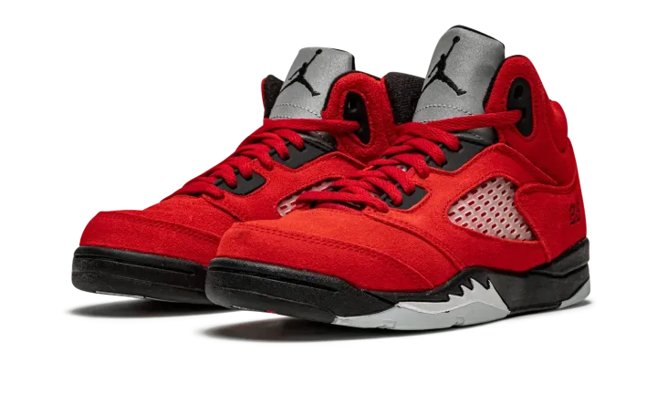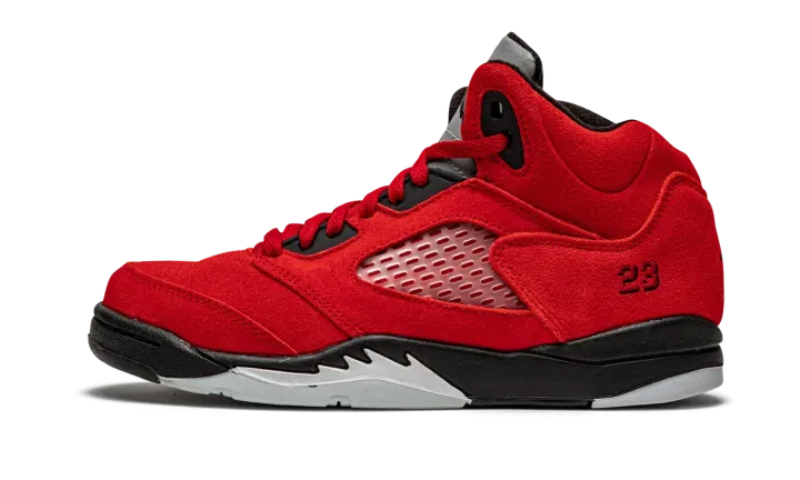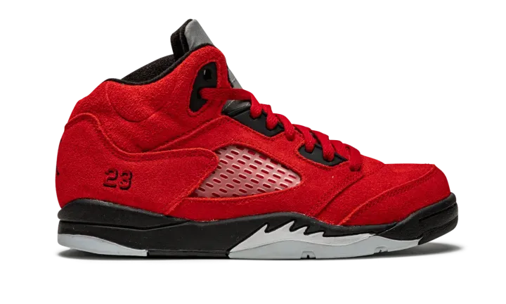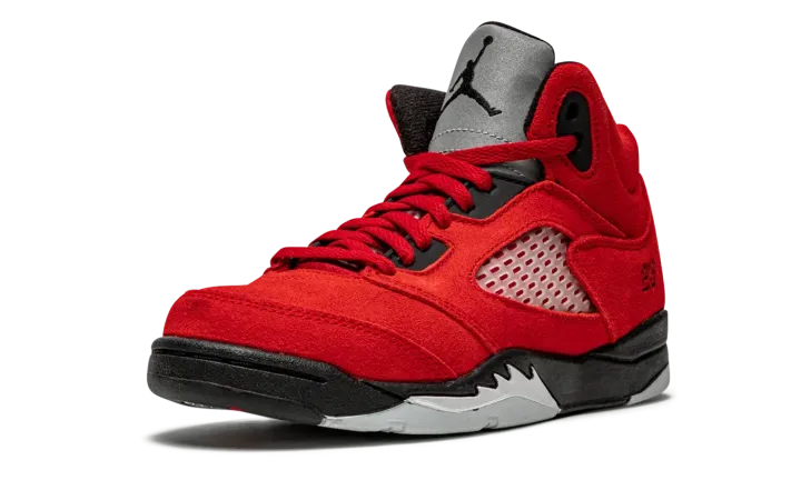 The Jordan 5 PS "Raging Bull" is the preschool sizing of the first-ever standalone release of one of the most popular non-original Air Jordan colorways. Originally appearing in 2009's "Defining Moments Pack" next to an all-black Jordan 5, the "Raging Bull" honored Michael's time with the Chicago Bulls in an all-red suede design that foreshadowed the all-red sneaker movement that occurred just a few years following the shoe's first release. Here, the modern version of the "Raging Bull" is dressed in the same fiery shade of Varsity Red suede. Clear netting can be found on the mid-panel and tongue. A black Jumpman and "23" detailing are embroidered on the tongue and lateral heel, respectively. Underfoot, the black painted midsole displays white shark tooth detailing. Release date: April 10, 2021.