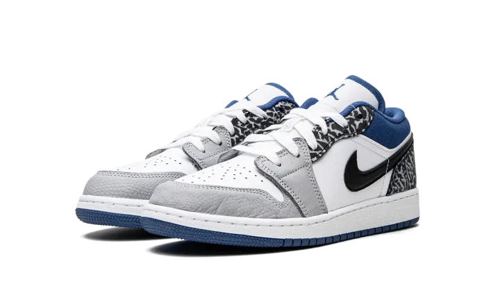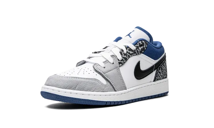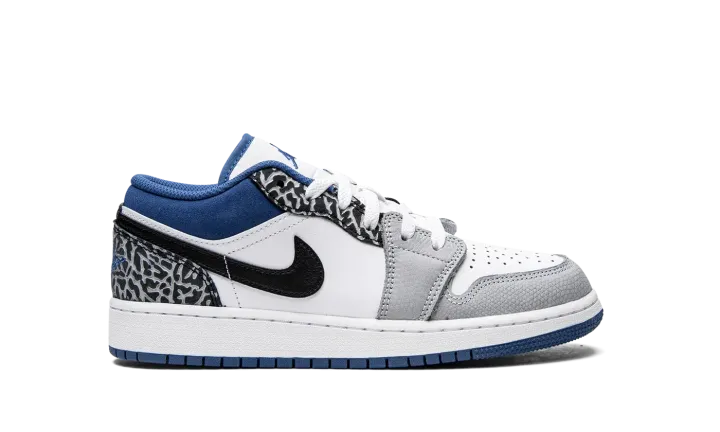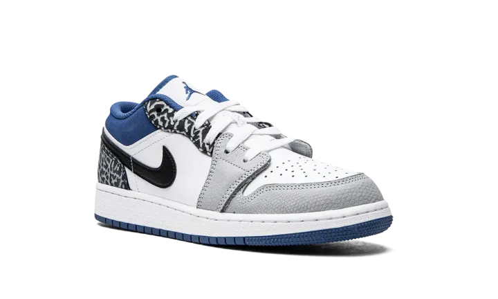 The Air Jordan 1 Low SE GS "True Blue" is the grade school children's sizing of the colorway of Michael Jordan's first signature shoe that pays homage to the original Air Jordan 3 of the same name. The "True Blue" Jordan 1 Low SE features design elements and colors lifted from the Jordan 3 "True Blue" that was originally released in 1988. The perforated toe and mid-panel are designed in white leather. Contrasting light grey leather appears on the toe cap and forefoot. Classic elephant patterning is found on the upper eyelet panel and on the heel with blue "Wings" embroidery. A black leather Swoosh resides on the sides. A Dark Marina Blue Jumpman logo appears on the white leather tongue. Additional blue accenting comes into play on the suede collar and on the underside of the tongue. Release date: June 11, 2022