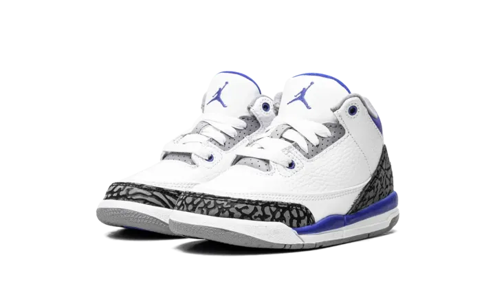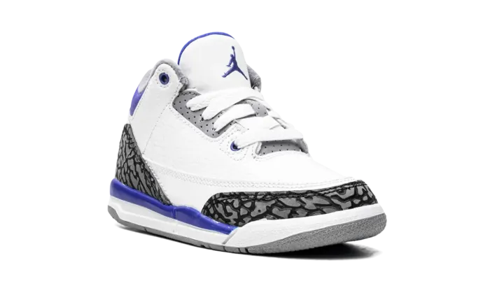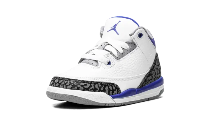 The Jordan 3 PS "Racer Blue" is the preschool sizing of the July 2021 release of Michael Jordan's third signature shoe in a versatile colorway. The "Racer Blue's" color block is informed by another Air Jordan 3 look: the model's original "Fire Red" colorway that was released by Nike in 1988. Like the "Fire Red," the "Racer Blue" features a white tumbled leather construction, but trades the "Fire Red's" red accenting for blue. Also, the grey elephant print found on the toe and heel is darker than the material found on the "Fire Red" and other Air Jordan 3 releases. Dotted Racer Blue leather appears on the collar and mid-panel. The dark blue hue can also be found on the Jumpman on the heel and on the embroidered Jumpman on the white tumbled leather tongue. Release date: July 10, 2021