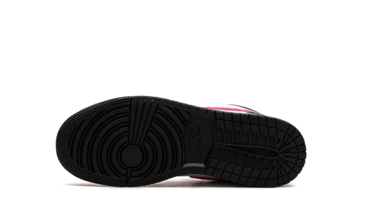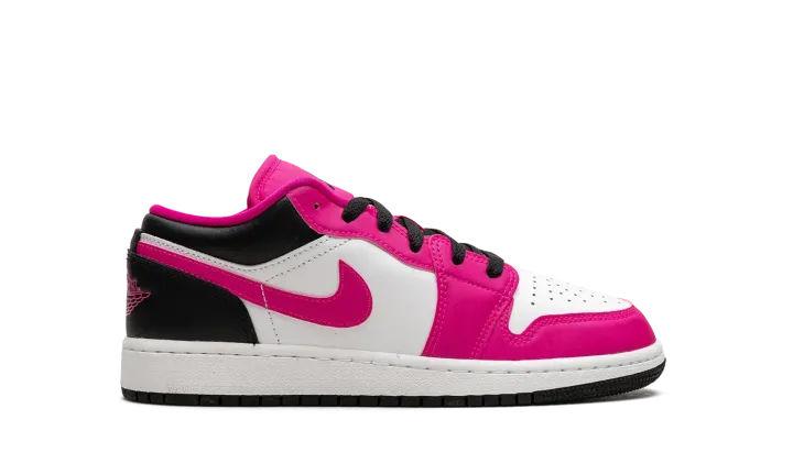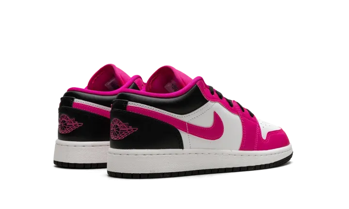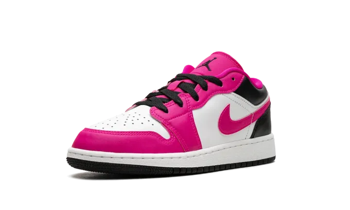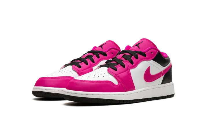 The Air Jordan 1 Low GS "Fierce Pink" is a youth sizing colorway of the retro basketball shoe with vibrant pink accents. The colorway is complete with Fierce Pink leather on the toe cap, forefoot, eyelets, and Swoosh. Contrasted white leather is seen on the perforated toe and mid-panel. A Fierce Pink "Wings" logo is embroidered on the black leather heel. Black Jumpman branding is found on the tongue. Underfoot, the shoe is rounded into form with a white rubber midsole and black outsole. Release date: May 13, 2023